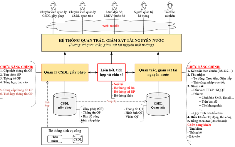 Hệ thống sẽ bao gồm: Dữ liệu cấp phép khai thác, hành nghề, xả thải: Thống kê toàn bộ giấy phép do Bộ và địa phương cấp, tình trạng hiệu lực, thông tin chủ giấy phép, vị trí công trình, lưu lượng, thời gian. Dữ liệu quan trắc tài nguyên nước: Tích hợp từ gần 400 trạm quan trắc nước mặt và nước dưới đất hiện có, kết nối với dữ liệu khí tượng thủy văn, mực nước hồ chứa, sông suối và tầng chứa nước ngầm. Thông tin vận hành hồ chứa, công trình khai thác lớn: Bao gồm lưu lượng xả, mực nước hồ, lịch vận hành, dữ liệu đầu vào đầu ra. Bản đồ lưu vực sông, vùng cấm khai thác, vùng hạn chế: Giúp định hướng cấp phép, quy hoạch khai thác sử dụng bền vững. Dữ liệu kiểm tra xử phạt vi phạm hành chính, thanh tra: Phục vụ công tác giám sát và cảnh báo sớm.