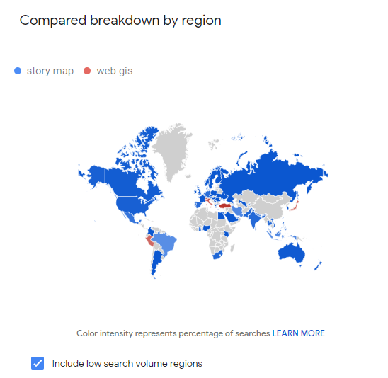 Hình 1. Các quốc gia quan tâm đến “Story Map” thể hiẹn màu xanh. Các quốc gia quan tâm đến “Web GIS” là mà đỏ. Mức độ quan tâm đến Story Map nhiều hơn Web GIS.
