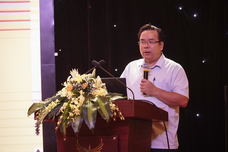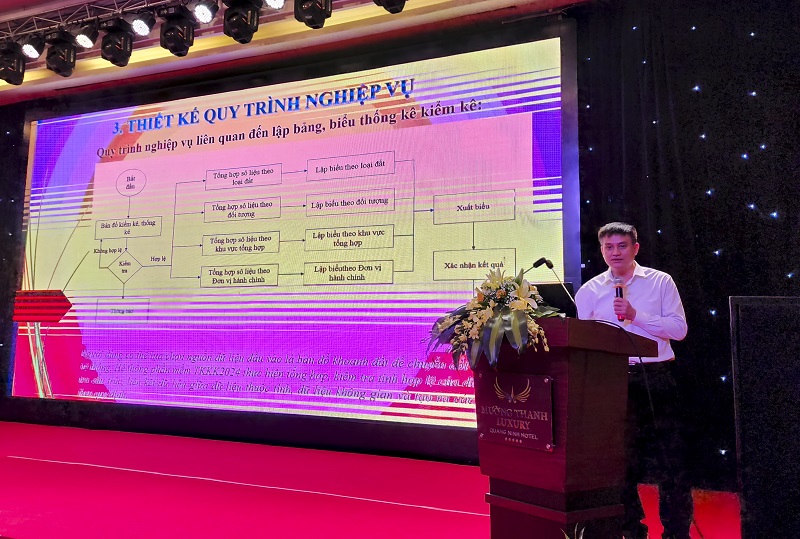 Ông Lê Hồng Văn, Giám đốc Trung tâm dữ và thông tin đất đai, Cục Đăng ký và Dữ liệu thông tin đất đai (Bộ Tài nguyên và Môi trường) trình bày tập huấn về KKĐĐ chuyên đề (Kiểm kê chuyên đề về quản lý, sử dụng đất sân gôn; cảng hàng không, sân bay; khu vực sạt lở, bồi đắp; đất có nguồn gốc từ nông, lâm trường); hướng dẫn và trình bày phần mềm KKĐĐ năm 2024.
