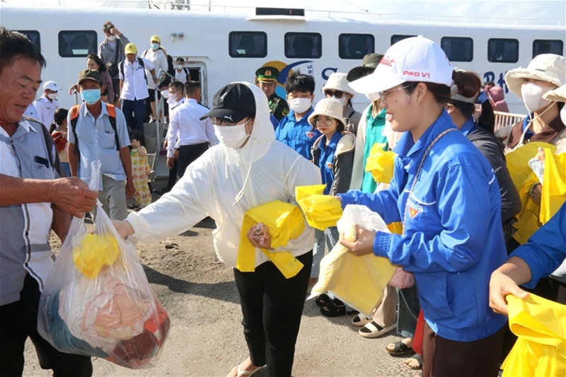 Các đoàn viên, thanh niên đang vận động du khách không vứt rác xuống biển trên huyện đảo Phú Quý