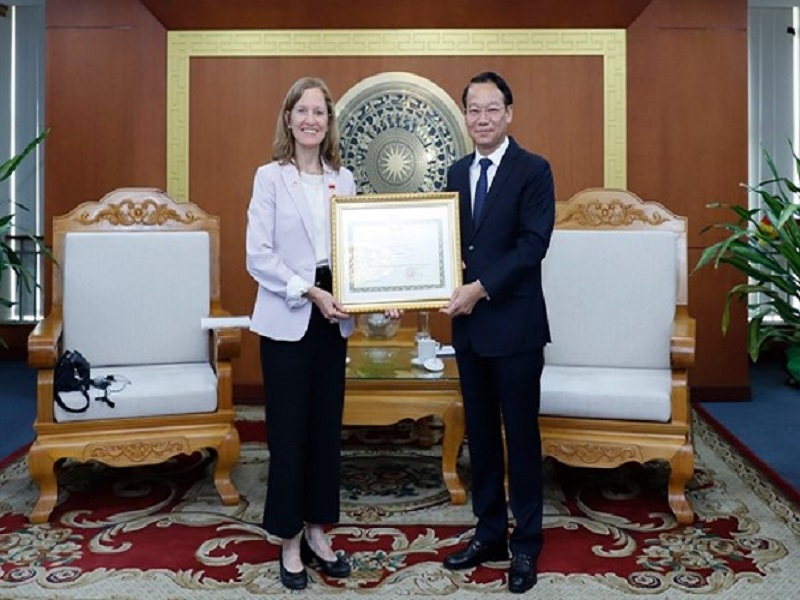 Bộ trưởng Đỗ Đức Duy đã trao tặng Kỷ niệm chương vì sự phát triển ngành nông nghiệp và môi trường Việt Nam đến bà Aler Grubbs - Tổng Giám đốc USAID tại Việt Nam.