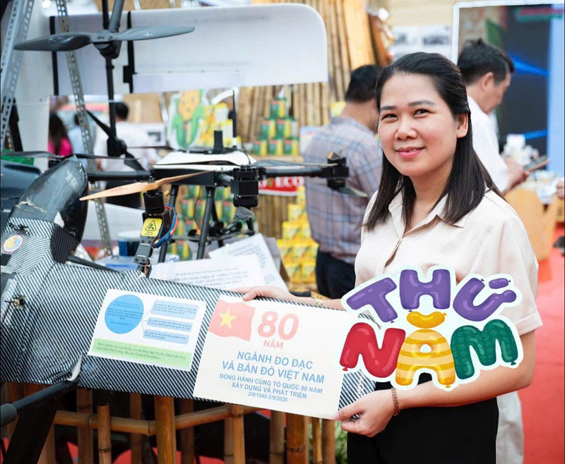 Khách thăm quan Check in tại gian hàng trưng bày các sản phẩm của ngành Đo đạc và Bản đồ Việt Nam