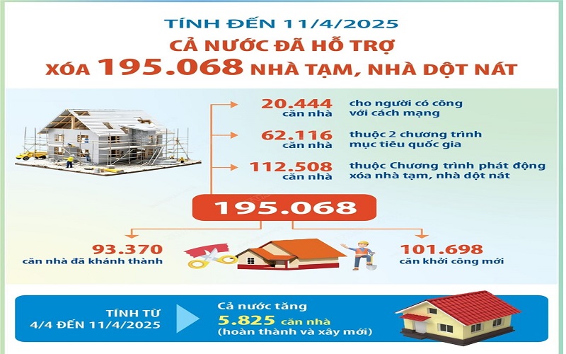 Theo số liệu báo cáo của các địa phương trên phần mềm cập nhật đến ngày 26/4/2025, cả nước đã hỗ trợ xóa nhà tạm, nhà dột nát được 208.357 căn (trong đó: khánh thành 108.956 căn và khởi công, xây dựng dở dang 99.401 căn). Cụ thể: Hỗ trợ nhà ở đối với người có công với cách mạng là 25.356 căn (khánh thành 10.921 căn và khởi công, xây dựng dở dang 14.435 căn). Hỗ trợ nhà ở thuộc 02 Chương trình mục tiêu quốc gia là 59.054 căn (khánh thành: 39.224 căn và khởi công, xây dựng dở dang 19.810 căn). Hỗ trợ nhà ở thuộc Chương trình xóa nhà tạm, nhà dột nát là 123.947 căn (khánh thành 59.291 căn và khởi công và xây dựng dở dang 64.656 căn).