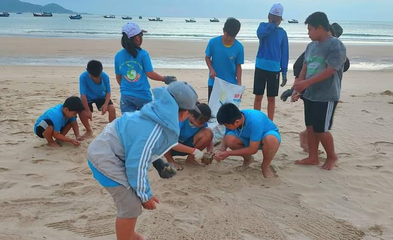 Các bạn nhỏ ở Khánh Hòa tham gia lượm rác bãi biển