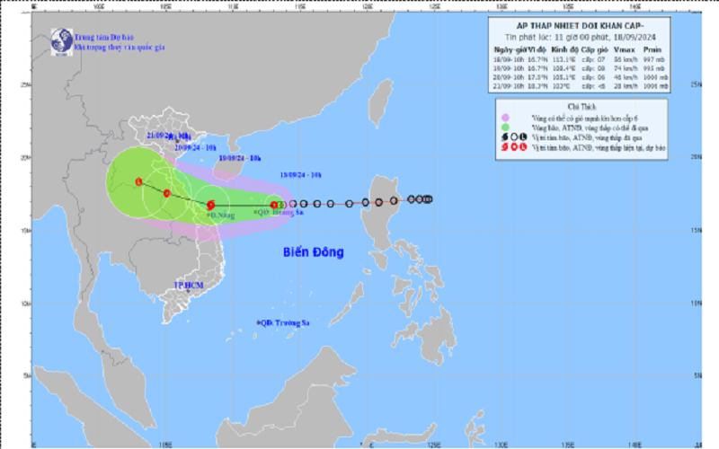 Theo Trung tâm Dự báo KTTV Quốc gia, áp thấp nhiệt đới trên Biển Đông đang mạnh lên và dự kiến sẽ trở thành bão trong vòng 24 giờ tới. Khu vực các tỉnh miền Trung được cảnh báo về nguy cơ mưa lớn, gió mạnh trên đất liền và vùng ngoài khơi, đặc biệt cần cảnh giác với nguy cơ lũ quét và sạt lở đất từ ngày 18/9 đến hết ngày 22/9. Trong đó, trọng tâm mưa tập trung ở Quảng Trị, Thừa Thiên Huế, Đà Nẵng