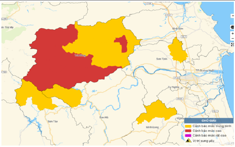 Bản đồ nguy cơ lũ quét, sạt lở đất đá trên các khu vực của tỉnh Quảng Ngãi được cảnh báo vào hồi 11h30 ngày 18/9. Ảnh: Trung tâm Dự báo KTTV Quốc gia