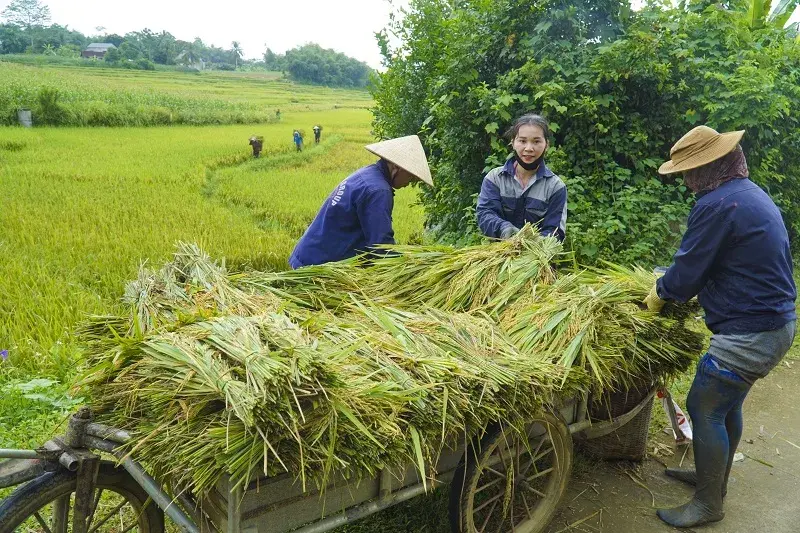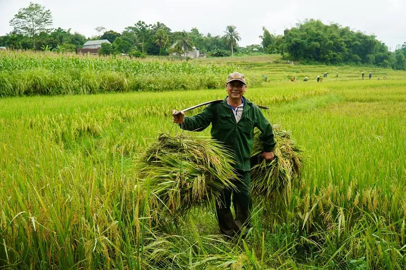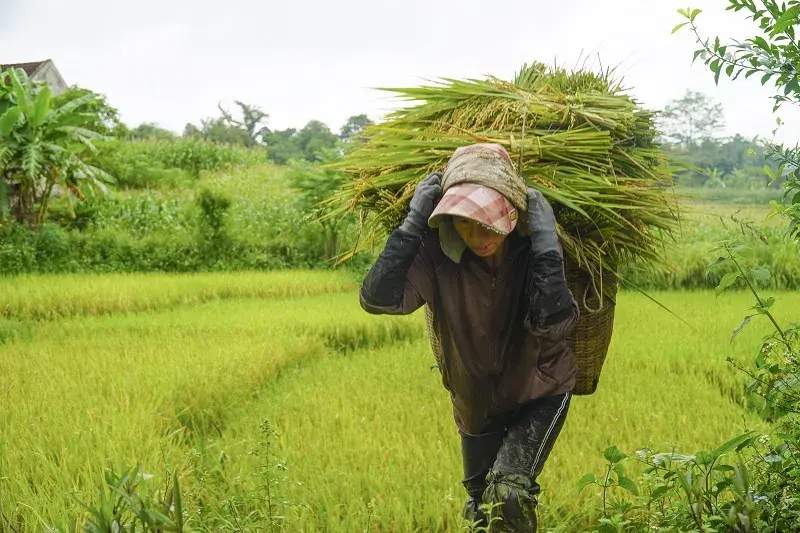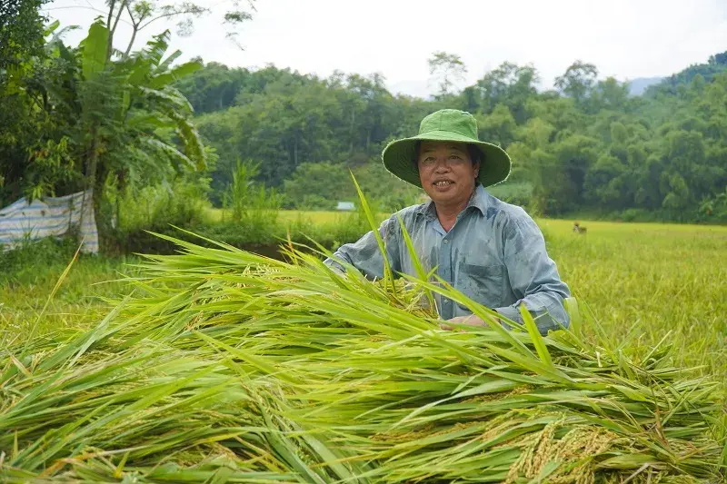 Dưới thung lũng, từng bậc ruộng xếp tầng, uốn lượn theo triền núi, vàng óng trong nắng sớm. Đẹp là thế, nhưng với ông Thân, mỗi thửa ruộng ấy là cả một thử thách. “Ở đây ruộng bậc thang, bùn lầy, không có chỗ cho máy gặt xuống. Chỉ có liềm với đôi tay người nông dân. Gặt xong lại phải gùi hoặc gánh từng bao lúa lên bờ. Một chuyến cũng ngót nghét 40kg. Vất vả vô cùng nhưng không tranh thủ thì bão về mất trắng hết”, ông nói, giọng gấp gáp như nhịp liềm lia trên tay.