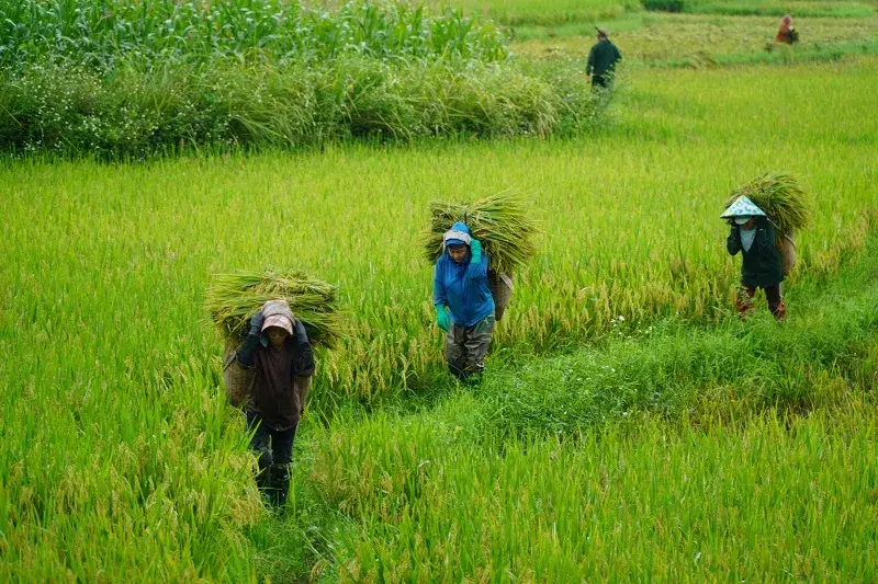Trên triền núi dốc, từng tốp người nối nhau gùi lúa. Tiếng bước chân lạo xạo trên đất ướt, tiếng cười xen lẫn tiếng thở hổn hển. Trẻ con tranh thủ lúc rảnh nhặt những bông lúa rơi, chạy lon ton quanh bờ ruộng. Người già ngồi ở hiên nhà, đan lại từng chiếc gùi tre để kịp dùng tiếp.