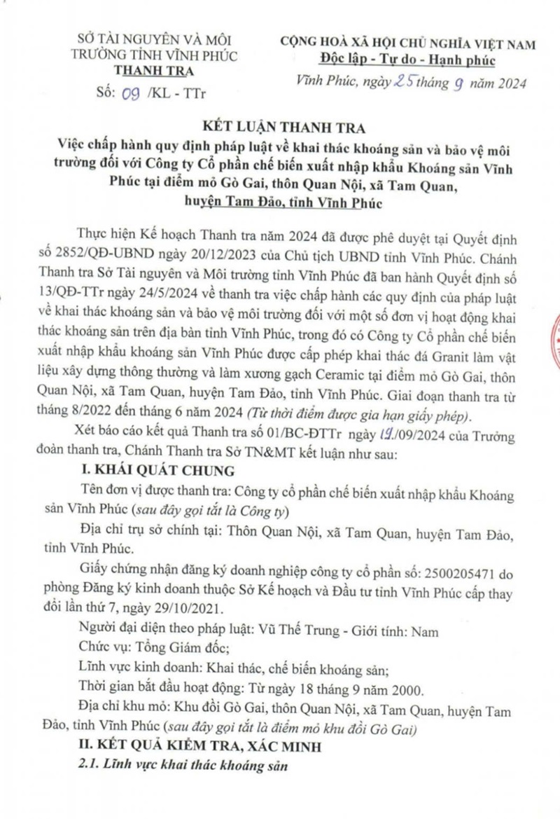 Kết luận cũng đề nghị Giám đốc sở Tài nguyên và Môi trường tỉnh Vĩnh Phúc chỉ đạo phòng Khoáng sản, tài nguyên nước và khí tượng thủy văn, phòng Quản lý môi trường căn cứ chức năng nhiệm vụ được giao tăng cường đôn đốc, hướng dẫn, kiểm tra thường xuyên việc chấp hành pháp luật về khoáng sản, bảo vệ môi trường đối với hoạt động khai thác thác đá Granit làm vật liệu xây dựng thông thường và làm xương gạch Ceramic tại điểm mỏ Gò Gai, thôn Quan Nội, xã Tam Quan, huyện Tam Đảo, tỉnh Vĩnh Phúc của Công ty Cổ phần chế biến xuất nhập khẩu khoáng sản Vĩnh Phúc để kịp thời phát hiện, chấn chỉnh và xử lý vi phạm theo quy định của pháp luật.