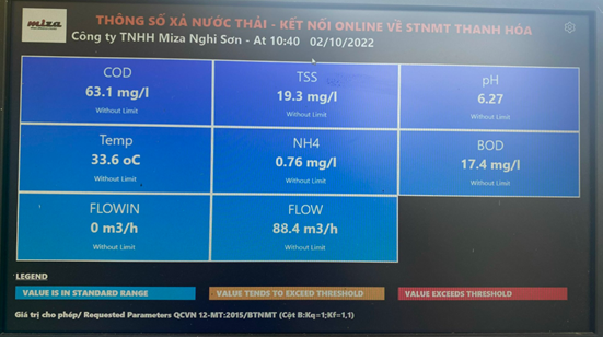Hiện nay, Công ty TNHH Miza Nghi Sơn đang là nhà máy sản xuất có hệ thống xử lý nước thải được đầu tư bài bản, quy mô lớn, tự động. Được xây dựng trên diện tích rộng 6.000m2 với tổng thể tích là 12.000m3, hệ thống xử lý được 4.000 m3 nước thải/ngày đêm, có thể đáp ứng được khi sản lượng tăng trên 120.000 tấn giấy/năm. Đặc biệt, Miza Nghi Sơn còn có thêm hệ thống xử lý kỵ khí với công nghệ tiên tiến nhất (Tháp kỵ khí IC..) giúp loại bỏ TSS, BOD, COD, màu, mùi; Hệ thống xử lý cấp 3: Xử lý oxi hóa khử bằng các bể phản ứng Fenton loại bỏ COD trơ, BOD, Màu, mùi và hệ thống vận hành kiểm soát DCS – tự động 100%. Chất lượng nước thải ra môi trường vì thế đạt tiêu chuẩn gần hạng A (Theo QCVN12-MT:2015/BTNMT và QCVN40:2011/BTNMT), trong khi ĐTM và giấy phép xả thải chỉ yêu cầu tiêu chuẩn B.
