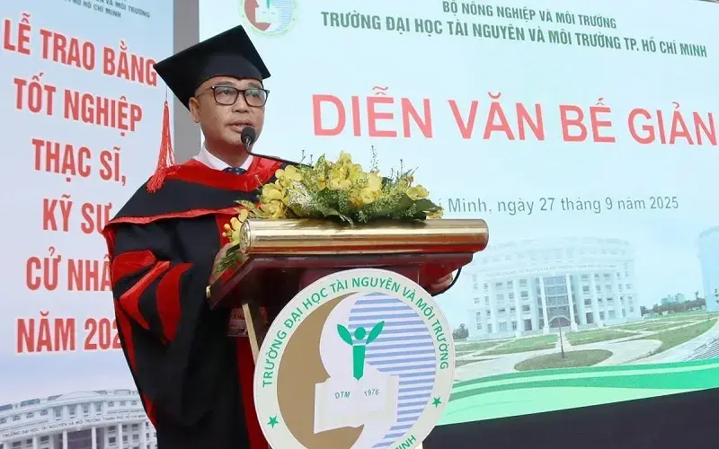Chia sẻ tại buổi lễ, PGS.TS. Huỳnh Quyền - Hiệu trưởng HCMUNRE gửi lời chúc mừng tới người học: “Sự kiện hôm nay là kết quả của biết bao nỗ lực, cố gắng không ngừng nghỉ trong suốt những năm tháng học tập và rèn luyện dưới mái trường này”. Hiệu trưởng đồng thời nhấn mạnh, tốt nghiệp không chỉ là kết thúc một quá trình học tập, mà còn là khởi đầu cho một chặng đường mới, hành trình xây dựng sự nghiệp, đóng góp cho cộng đồng và đất nước.