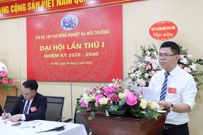 Đồng chí khẳng định, đây là một dấu mốc chính trị quan trọng, đánh dấu sự trưởng thành và phát triển của Chi bộ Tạp chí Nông nghiệp và Môi trường trong tiến trình xây dựng và phát triển đơn vị, đặc biệt là trong bối cảnh đất nước bước vào kỷ nguyên số, kỷ nguyên đổi mới, hội nhập và phát triển toàn diện. Đại hội Chi bộ lần thứ I có nhiệm vụ tổng kết việc thực hiện Nghị quyết Đại hội nhiệm kỳ trước, đánh giá khách quan những kết quả đã đạt được, chỉ ra những mặt còn tồn tại, hạn chế, đồng thời thảo luận và thông qua phương hướng, mục tiêu, nhiệm vụ cho nhiệm kỳ 2025 – 2030. Bên cạnh đó, Đại hội cũng dành thời gian đóng góp ý kiến vào Dự thảo Báo cáo chính trị trình Đại hội Đảng bộ Bộ Nông nghiệp và Môi trường lần thứ I, nhiệm kỳ 2025 – 2030, cũng như các dự thảo văn kiện quan trọng của Trung ương Đảng khóa XIII trình Đại hội XIV.