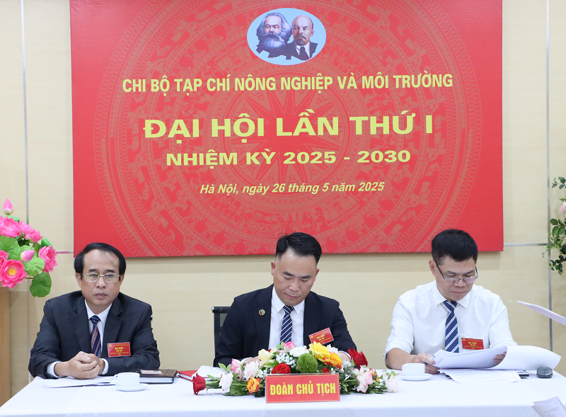 Để điều hành Đại hội, các đại biểu đã tiến hành bầu Đoàn Chủ tịch gồm 03 đồng chí: TS. Đào Xuân Hưng, Bí thư Chi bộ, Tổng Biên tập Tạp chí NN&MT; TS. Dương Thanh Hải, Phó Bí thư Chi bộ, Phó Tổng Biên tập Tạp chí NN&MT; ThS. Kiều Đăng Tuyết, Phó Tổng Biên tập Tạp chí NN&MT. Đại hội cũng nhất trí giới thiệu đồng chí Hoàng Thị Phương và Ngô Thị Thu Quyên làm Thư ký Đại hội