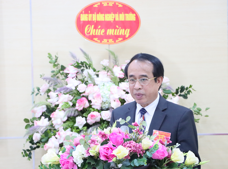 Đồng chí Phùng Đức Tiến, Ủy viên Ban thường vụ Đảng ủy, Trưởng Ban Tuyên giáo và Dân vận, Thứ trưởng Bộ Nông nghiệp và Môi trường cùng các đồng chí đại diện cho các Ban của Đảng ủy Bộ Nông nghiệp và Môi trường tặng hoa chúc mừng Đại hội