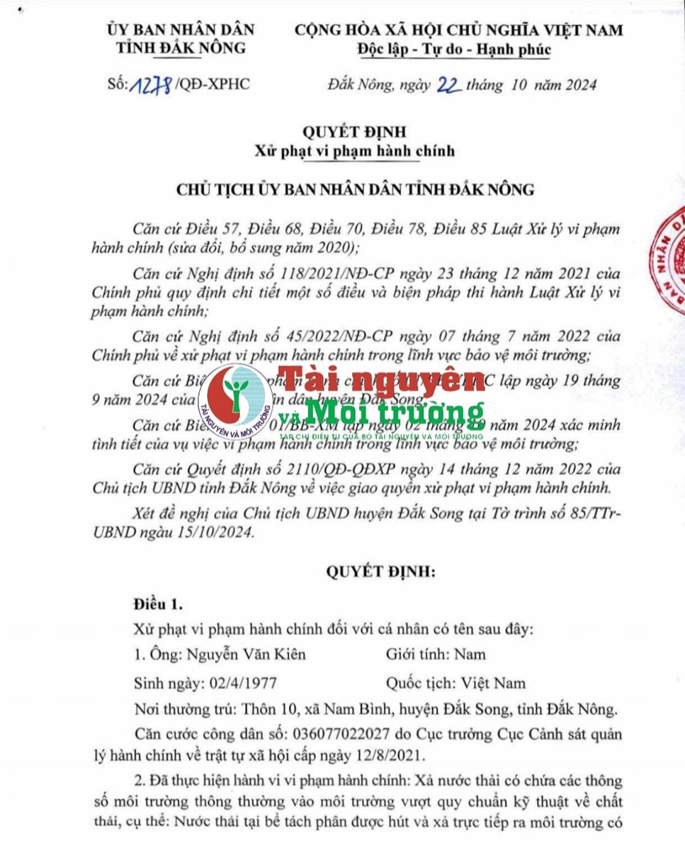 Ngày 22/10/2024 UBND tỉnh Đắk Nông đã ra quyết định xử phạt vi phạm hành chính đối với ông Nguyễn Văn Kiên về hành vi xả nước thải có chứa các thông số môi trường thông thường vào môi trường vượt quy chuẩn kỹ thuật về chất thải, cụ thể: Nước thải tại bể tách phân được hút và xả trực tiếp ra môi trường có chứa các thông số môi trường thông thường vượt quy chuẩn kỹ thuật về chất thải tại 02 điểm xả.