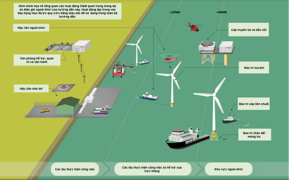 Tổng quan về hoạt động vận hành và bảo trì dự án điện gió ngoài khơi. (Nguồn: Theo “Hướng dẫn vận hành và bảo trì dự án điện gió ngoài khơi Vương quốc Anh” do Doanh nghiệp Scotland và The Crown Estate xuất bản)[TB2]