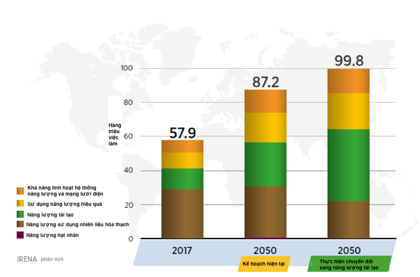 Theo một nghiên cứu việc làm toàn cầu, “Đo lường kinh tế xã hội của quá trình chuyển đổi sang năng lượng tái tạo: Tập trung vào vấn đề việc làm”, (Tên tiếng Anh "Measuring the socio-economics of transition: Focus on jobs") do Cơ quan Năng lượng Tái tạo Quốc tế (IRENA) thực hiện, các công việc trong lĩnh vực tái tạo và sử dụng năng lượng hiệu quả được dự báo sẽ vượt qua các công việc trong lĩnh vực năng lượng truyền thống vào năm 2050 trên toàn cầu. Hơn nữa, việc làm trong lĩnh vực năng lượng tái tạo có thể đạt mức tăng trưởng đáng kể nhất khi cán mốc 42 triệu người làm việc trong lĩnh vực này vào năm 2050 nếu chính phủ các nước thực hiện các chính sách chủ động hơn trong việc chuyển đổi năng lượng, như thể hiện trong biểu đồ dưới đây.