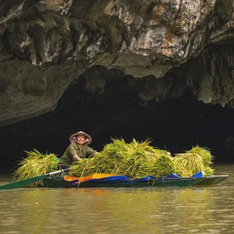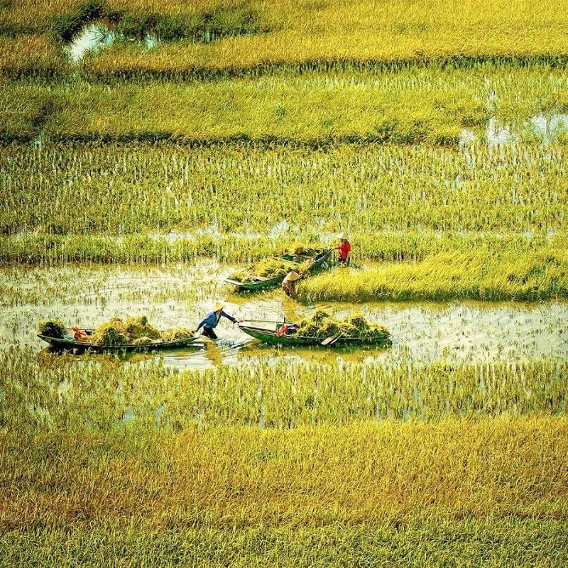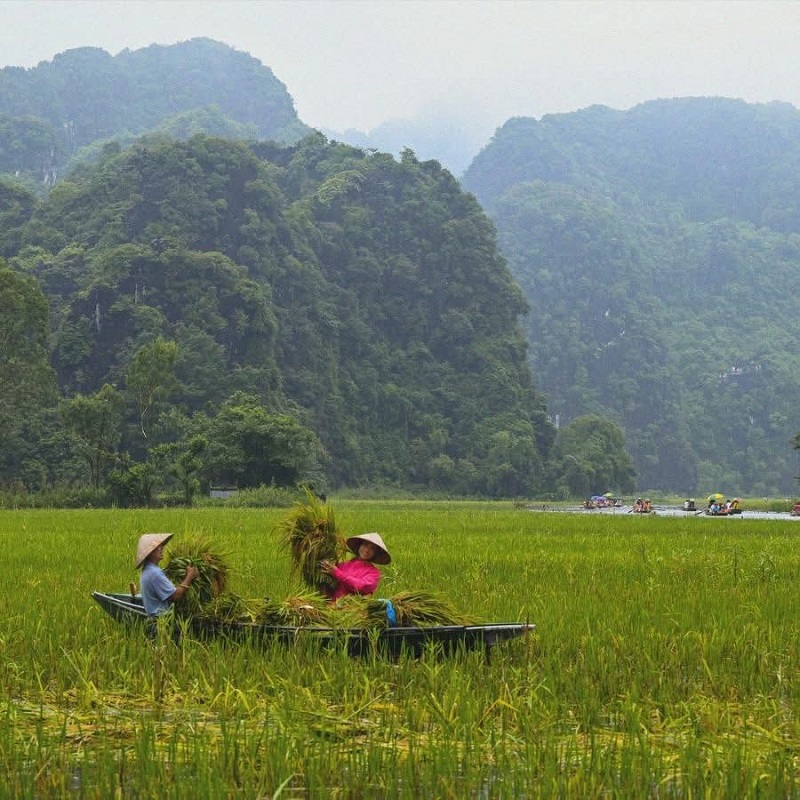 Không xe máy, không máy gặt, người dân Tam Cốc vẫn chọn cách thủ công: cắt lúa bằng tay, gánh chở về bằng thuyền tập kết trên bờ. Họ bảo, làm vậy để giữ cho Tam Cốc sự nguyên sơ, và cũng là giữ cho mình chút chậm rãi giữa guồng quay hiện đại.