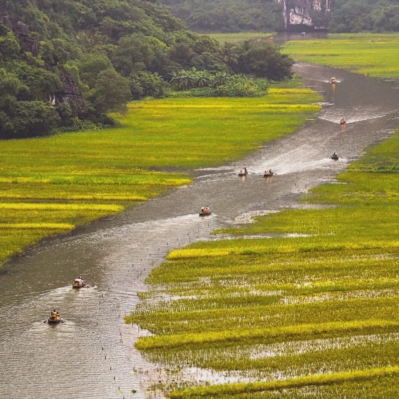 Khi nắng hạ vừa chạm ngõ, Tam Cốc bừng lên sắc vàng rực rỡ, mùa lúa chín trải dài như dải thảm óng ả vắt qua sông Ngô Đồng uốn lượn, ôm trọn vào lòng những dãy núi đá vôi sừng sững. Cảnh sắc nơi đây không chỉ là món quà của thiên nhiên, mà còn là thành quả của bao mùa mưa nắng và bàn tay cần mẫn của người nông dân cố đô Hoa Lư.
