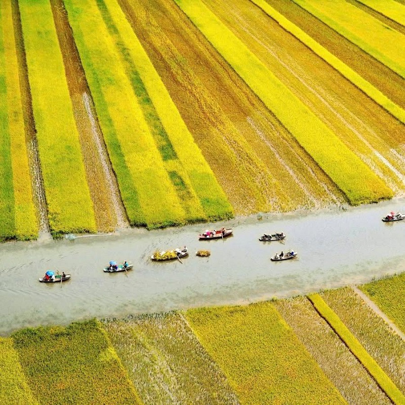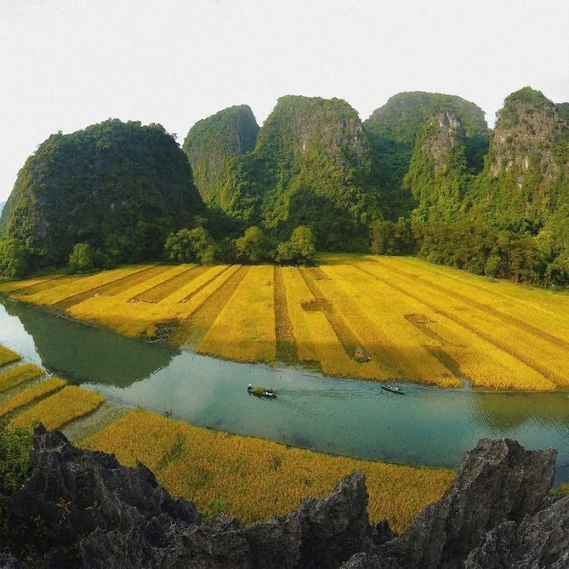 Tam Cốc mùa lúa chín như khoác lên mình chiếc áo mới vàng rực giữa núi non trùng điệp và dòng sông Ngô Đồng trong vắt. Từng thửa ruộng nối tiếp nhau, vẽ nên một bức tranh sơn thủy hữu tình. Đây không chỉ là mùa của lúa chín mà còn là mùa của du lịch, của bao nụ cười và ký ức được ghi lại.