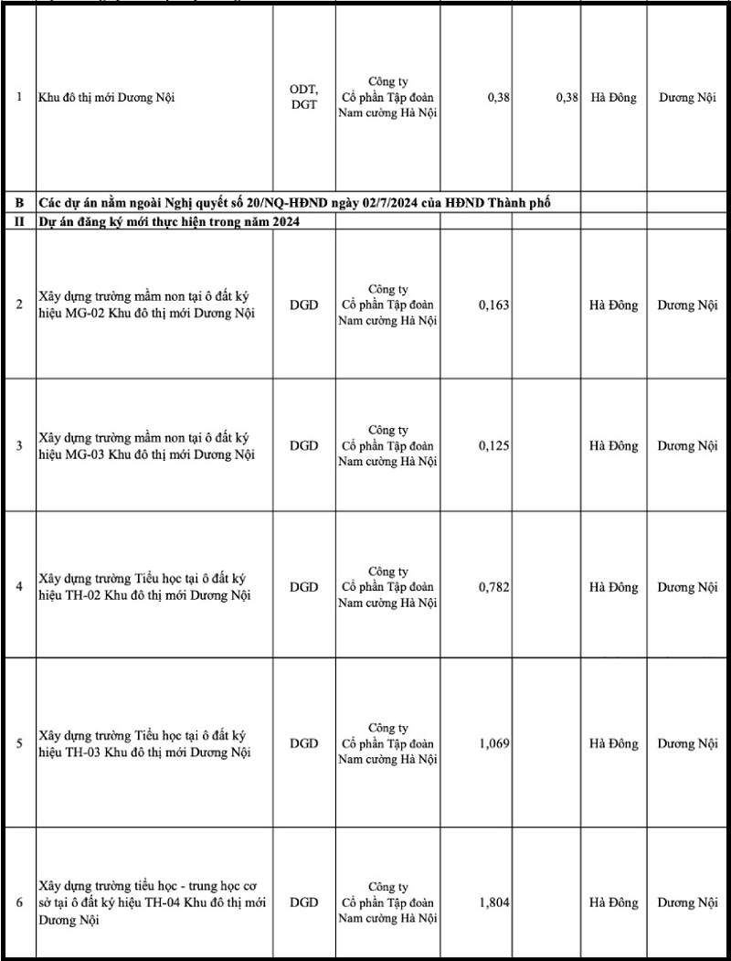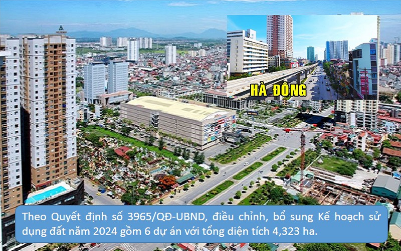 Tại quận Hà Đông, theo Quyết định số 3965/QĐ-UBND, điều chỉnh, bổ sung Kế hoạch sử dụng đất năm 2024 gồm 6 dự án với tổng diện tích 4,323 ha.