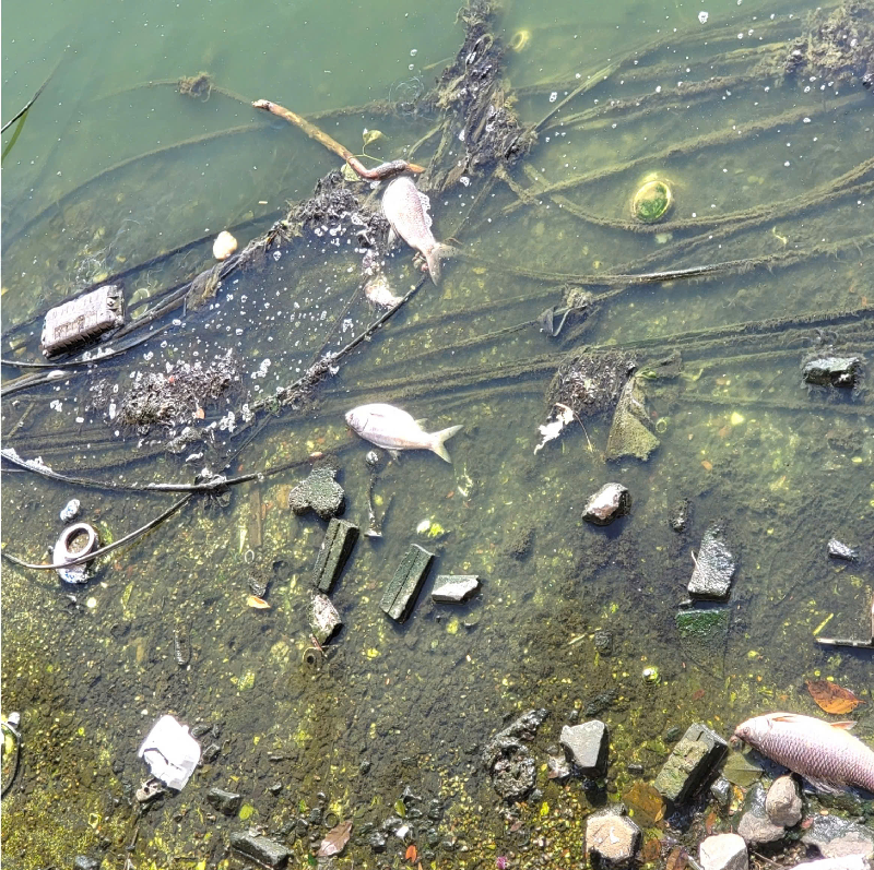 Hàng loạt xác cá chết bị sóng đánh trôi dạt vào ven hồ