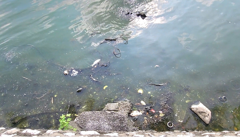 Xác cá chết rác thải nổi lềnh bềnh khiến mặt hồ khu vực đường Lạc Long Quân trở nên nhếch nhác ô nhiễm