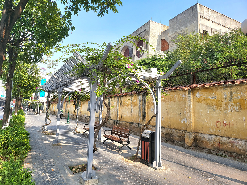 Những hàng hoa giấy chạy dọc tuyến đường được cải tạo với mục đích tạo cảnh quan xanh đô thị, phục vụ người đi bộ