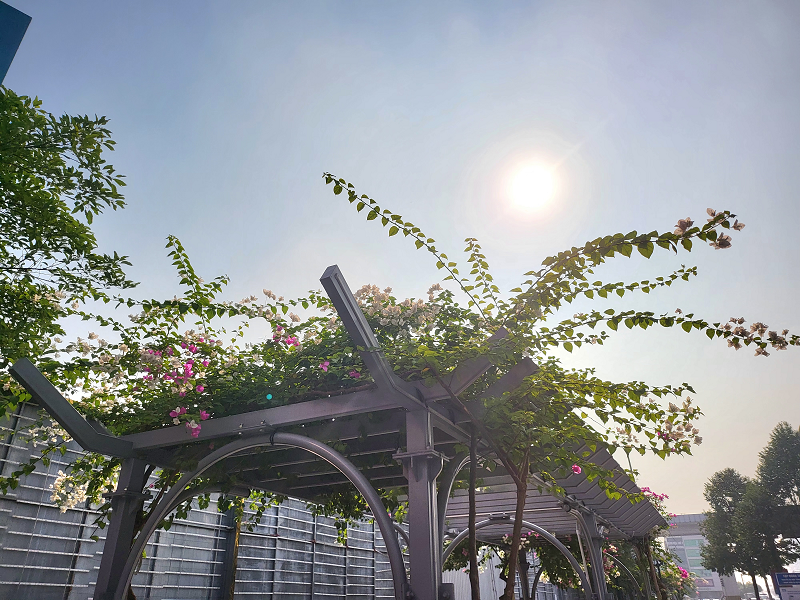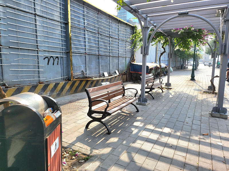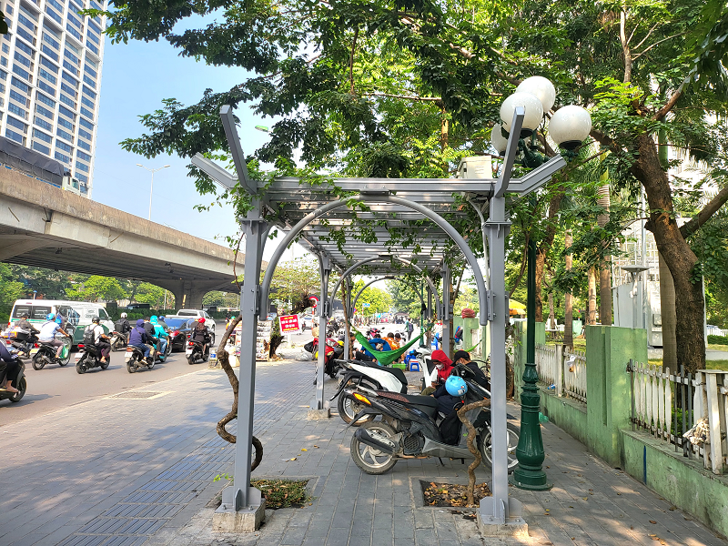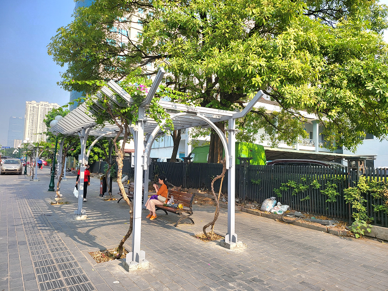Những cây hoa giấy đang phát triển, len lỏi trên giàn nhằm tạo mỹ quan và bóng mát cho người đi bộ. Loại cây được trồng chính là cây hoa giấy với mục đích tạo cảnh quan đô thị, phục vụ người đi bộ đây cũng là điểm check in lý tưởng cho người dân