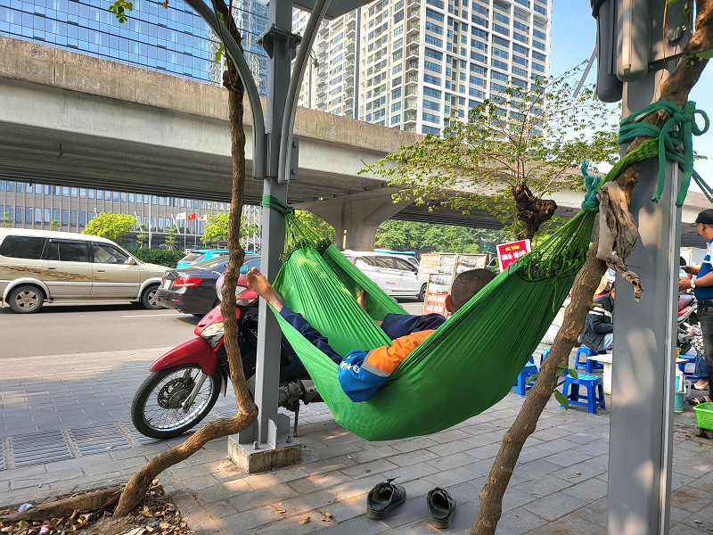 Giàn hoa cũng là nơi tiện lợi cho những người làm nghề xe ôm mắc võng vô tư nằm thư giãn