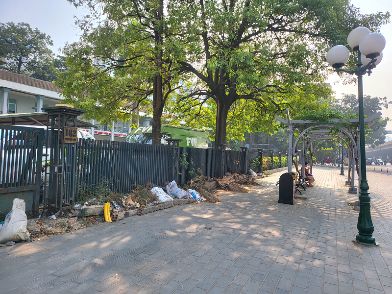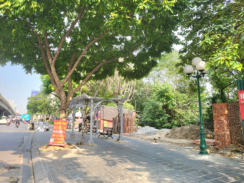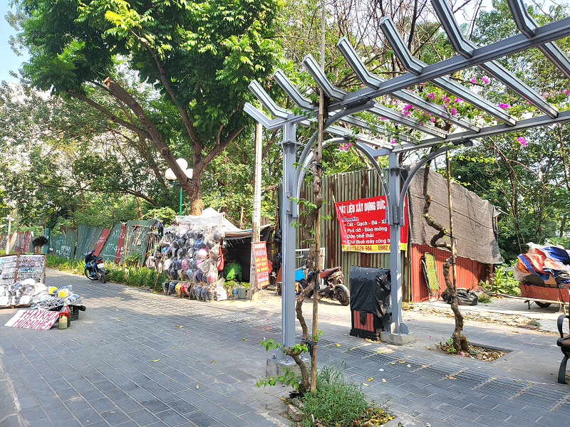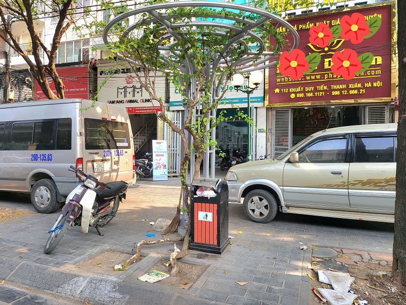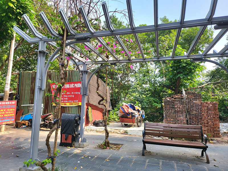 Qua ghi nhận của phóng viên Tạp chí Tài nguyên và Môi trường, thực tế cho thấy hai bên vỉa hè đường Khuất Duy Tiến, đoạn qua trụ sở UBND quận Thanh Xuân được cải tạo từ cuối năm 2023, đến nay đã cơ bản hoàn thành ngoài việc được lát đá mới, trên vỉa hè của tuyến đường còn xuất hiện nhiều giàn hoa bằng khung kim loại dưới dạng cổng chào, hình chiếc ô,... được phủ sơn màu bạc, bắt vít chắc chắn. Đây là dự án giàn hoa tạo cảnh quan đô thị, phục vụ người đi bộ đã đi vào hoàn thiện. Tuy nhiên, dù đã chính thức đi vào sử dụng nhưng những giàn hoa này đã bị biển quảng cáo, xe cộ "bủa vây", tập kết vật liệu xây dựng, rác thải sinh hoạt không được thu gom,…