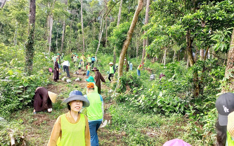 Những ngày 14-15 tháng 6/2025, không gian tĩnh lặng của Tịnh viện Vân Sơn trở nên rộn ràng mà thiêng liêng. Hơn 200 người gồm các vị tu sĩ, cư sĩ Phật giáo, linh mục, tu sĩ Thiên Chúa giáo, các tín đồ đạo Cao Đài, tín ngưỡng dân gian, nhóm thiện nguyện trẻ và người dân địa phương cùng nhau trồng 2.000 cây thông non trên triền đồi phía sau tịnh viện.
