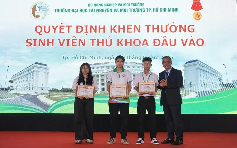 Một điểm nhấn tại Lễ khai giảng năm nay là phần vinh danh thủ khoa và á khoa đầu vào. Trong đó, Nguyễn Đoàn Phương Như (ngành Quản trị kinh doanh) đã xuất sắc trở thành thủ khoa khóa 2025; Phan Thị Ngọc Thanh (ngành Quản lý đất đai) và Trịnh Minh Tỉnh (ngành Khí tượng - Khí hậu học) là á khoa.