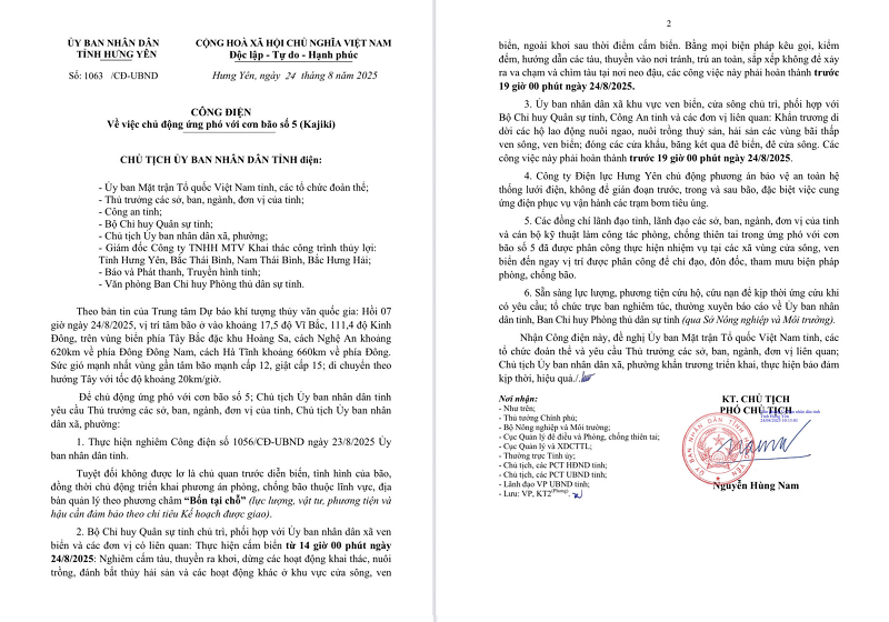 Công điện số 1063/CĐ-UBND tỉnh Hưng Yên