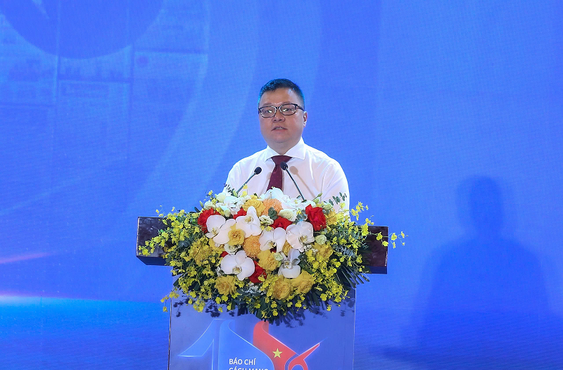 Đồng chí Lê Quốc Minh, Ủy viên Trung ương Đảng, Tổng Biên tập Báo Nhân Dân, Phó Trưởng Ban Tuyên giáo và Dân vận Trung ương, Chủ tịch Hội Nhà báo Việt Nam, Trưởng Ban Chỉ đạo Hội Báo toàn quốc 2025 phát biểu tại lễ khai mạc