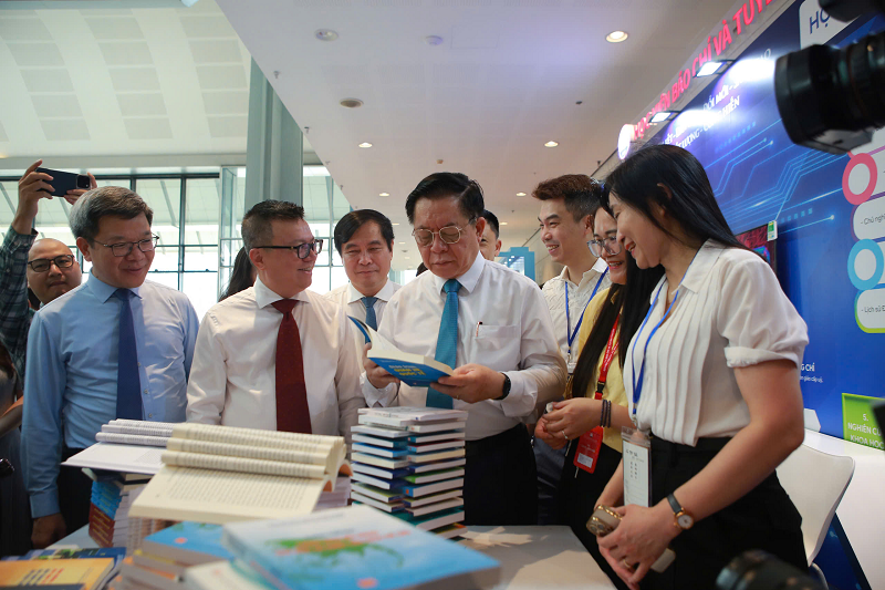 Đồng chí Nguyễn Trọng Nghĩa, Ủy viên Bộ Chính trị, Bí thư Trung ương Đảng, Trưởng Ban Tuyên giáo và Dân vận Trung ương, đồng chí Lê Quốc Minh, Chủ tịch Hội Nhà báo Việt Nam cùng các đại biểu tham quan gian trưng bày tại Hội báo