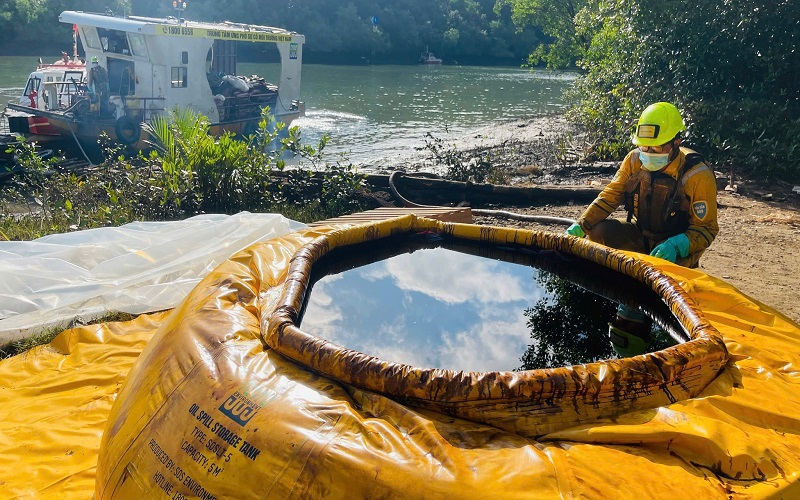 Lượng dầu thu gom sau sự cố tràn dầu trên sông Lòng Tàu (Cần Giờ) được chứa trong bể tạm chuyên dụng, dưới sự giám sát của lực lượng ứng phó SOS, nhằm hạn chế tối đa nguy cơ phát tán ra môi trường