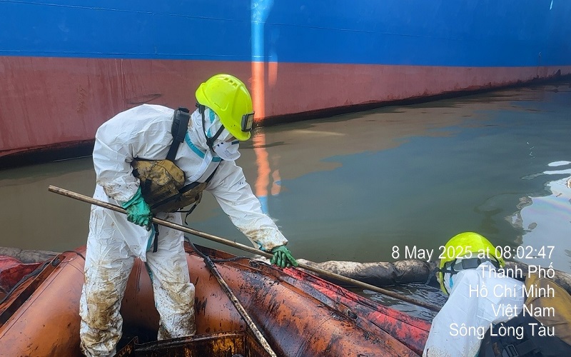 Nhân viên ứng phó sự cố môi trường trong trang phục bảo hộ chuyên dụng thu gom dầu loang ngay tại khu vực thân tàu trên sông Lòng Tàu (Cần Giờ), sáng 8/5/2025