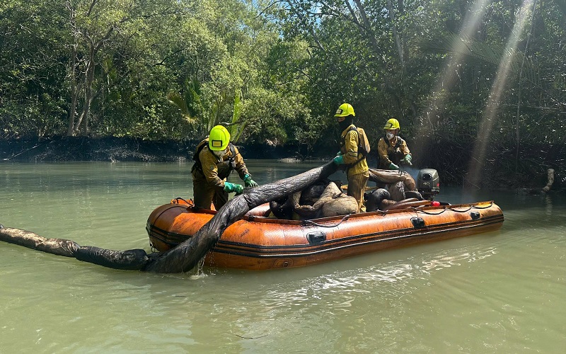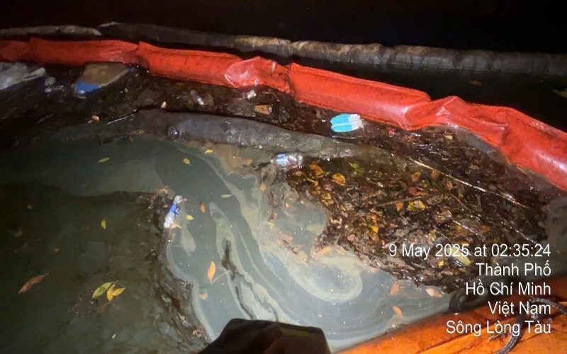 Dầu loang và rác thải bị sóng đánh dạt, vón cục trong khu vực phao quây trên sông Lòng Tàu (Cần Giờ) sau sự cố va chạm tàu KMTC SURABAYA và GLENGYLE, gây nguy cơ ô nhiễm nghiêm trọng đối với hệ sinh thái rừng ngập mặn