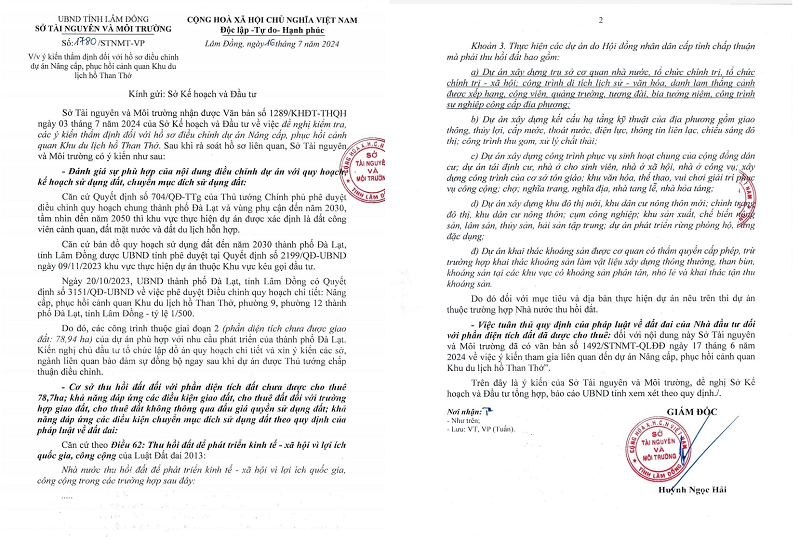 Vừa qua, Sở Tài nguyên và Môi trường nhận được Văn bản số 1289/KHĐT-THQH ngày 03/7/2024 của Sở Kế hạch và Đầu tư về việc đề nghị kiểm tra, các ý kiến thẩm định đối với hồ sơ điều chỉnh Dự án Nâng cấp, phục hồi cảnh quan Khu du lịch hồ Than Thở. Sau khi rà soát hồ sơ liên quan Sở Tài nguyên và Môi trường có ý kiến như sau: