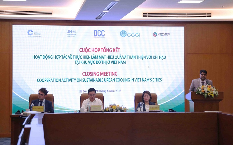Cuộc họp “Tổng kết hoạt động hợp tác về giải pháp làm mát hiệu quả, thân thiện với khí hậu và chống nắng nóng cực đoan tại khu vực đô thị ở Việt Nam” tổ chức tại Hà Nội vào ngày 28 tháng 8 năm 2025. Sự kiện quy tụ các đại diện đến từ DCC, GGGI và UN Environment Programme, cùng thảo luận về các giải pháp làm mát bền vững nhằm giảm thiểu tác động của biến đổi khí hậu tại các thành phố Việt Nam. Các chuyên gia nhấn mạnh tầm quan trọng của việc triển khai các công nghệ và giải pháp thân thiện với môi trường, góp phần vào chiến lược phát triển đô thị xanh và bền vững.