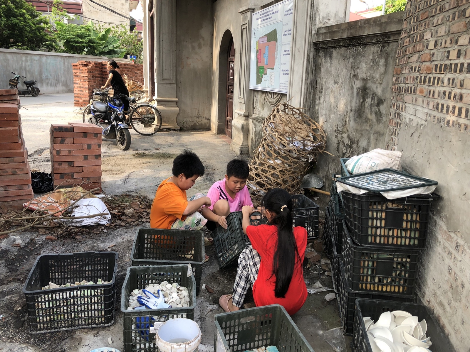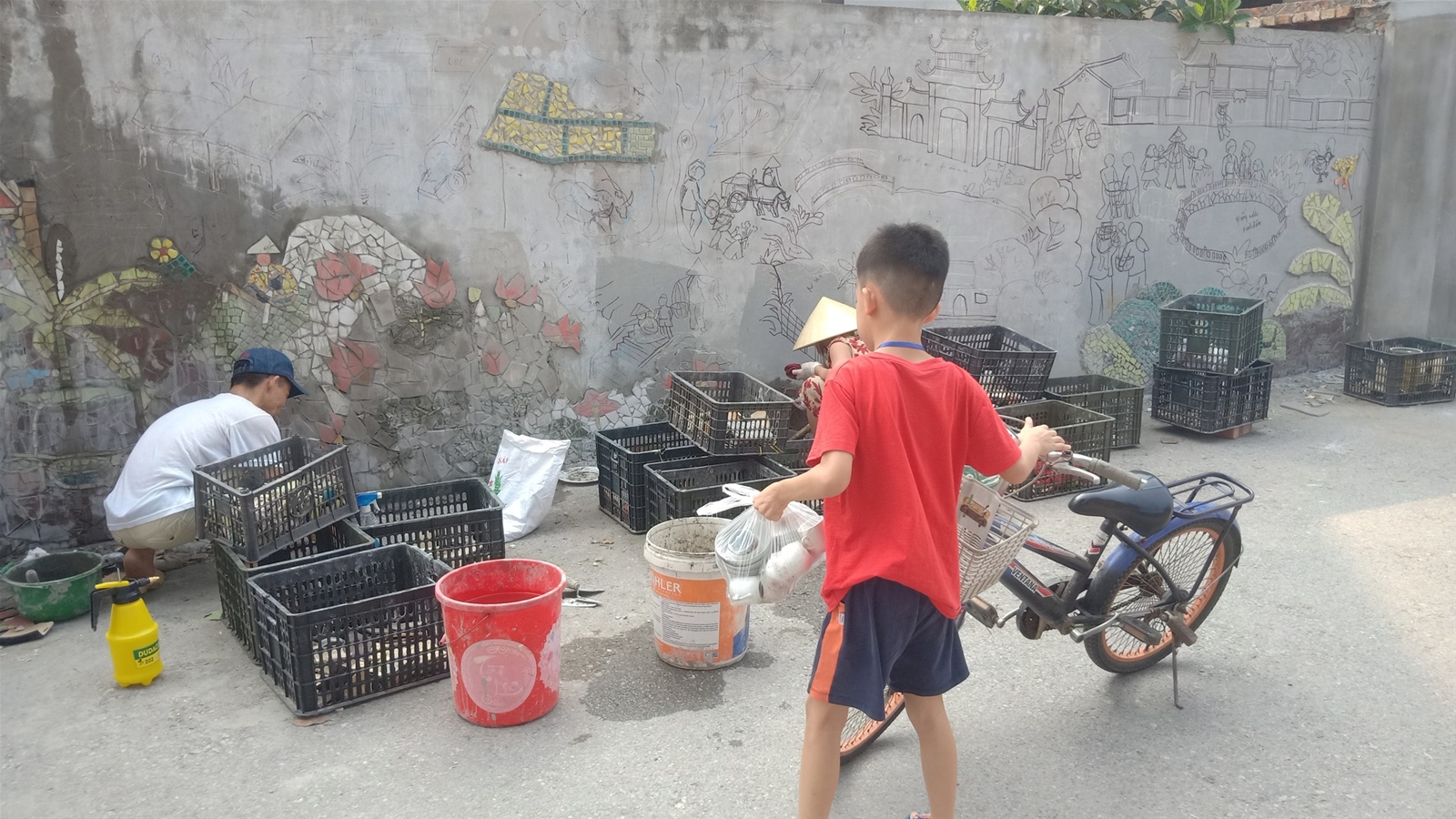 Chia sẻ phóng viên, trong suốt quá trình thực hiện, điều chị Liên cảm thấy thú vị nhất là quá trình thu gom vật liệu: "Vật liệu để tạo nên những bức tranh tường được chúng tôi thu gom từ rất nhiều nguồn. Có nguồn do mọi người đăng các bài làm tranh lên mạng xã hội, đã có những người bạn ở rất xa cũng đã đóng gói những bát đĩa vỡ của gia đình gửi cho chúng tôi. Ngoài ra cũng có các cô lao công, học sinh của làng đi thu gom. Hay đơn vị nơi tôi đang công tác đã hỗ trợ những chuyến xe sang làng gốm Bát Tràng để thu gom những vật liệu như lọ hoa, những viên gạch không đạt yêu cầu,... Những vật liệu bị bỏ đi này được chúng tôi xin về để đập ra và lấy những màu sắc gắn lên tranh." - chị Liên cho biết!.