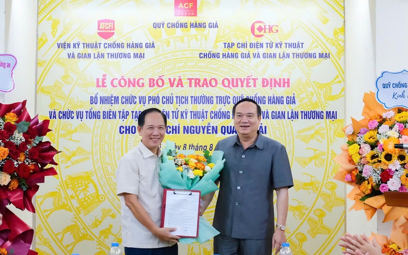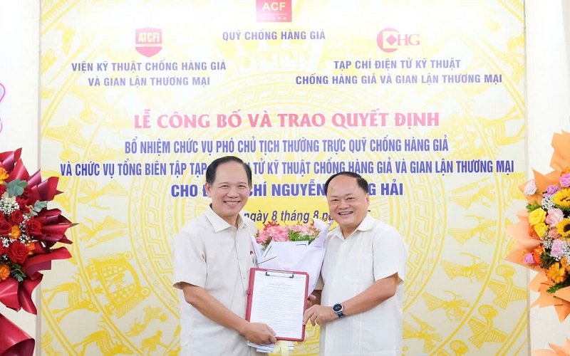 Đồng chí Phạm Lộc Ninh – Viện trưởng Viện Kỹ thuật Chống hàng giả và Gian lận thương mại đã trao Quyết định bổ nhiệm chức vụ Tổng Biên tập Tạp chí điện tử Kỹ thuật Chống hàng giả và Gian lận thương mại cho đồng chí Nguyễn Quang Hải.
