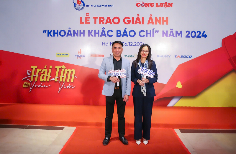 Ông Lê Trần Nguyên Huy- Quyền Tổng Biên tập Báo Nhà báo và Công luận, Trưởng Ban Tổ chức giải ảnh “Khoảnh khắc Báo chí” 2024 và bà Trần Lan Anh - Phó Tổng biên tập báo Nhà báo & Công luận, Phó trưởng Ban Tổ chức Giải trao Top 10 Khoảnh khắc Báo chí năm 2024 cho các tác giả đoạt giải