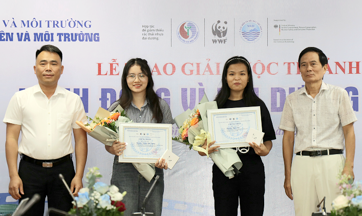 Ông Kiều Đăng Tuyết, Phó Tổng Biên tập Tạp chí TN&MT và bà Ngô Thị Lan Phương, chuyên gia Ban Quản lý dự án Giảm thiểu rác nhựa đại dương trao giải Ba cuộc thi cho các tác giả đoạt giải