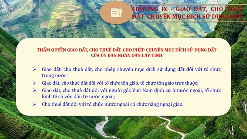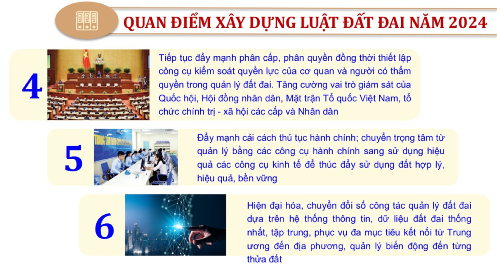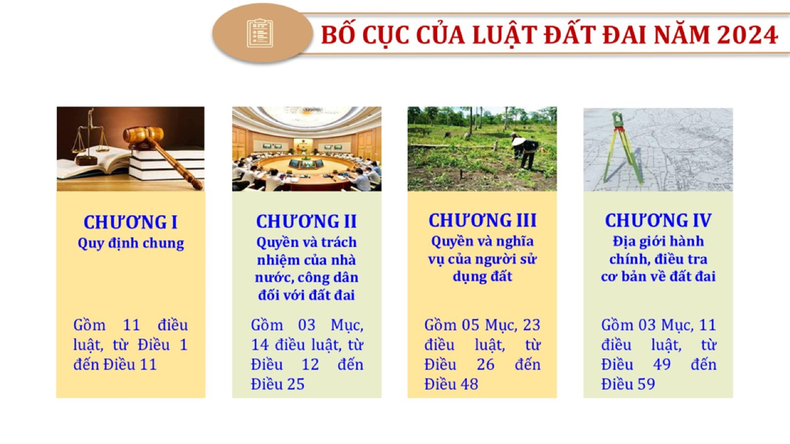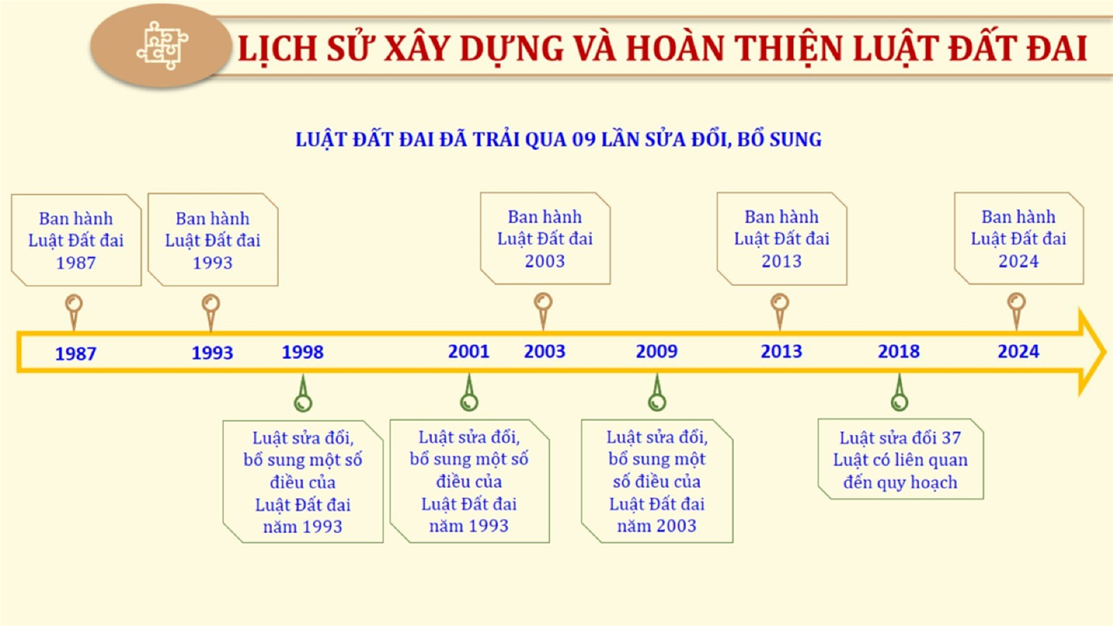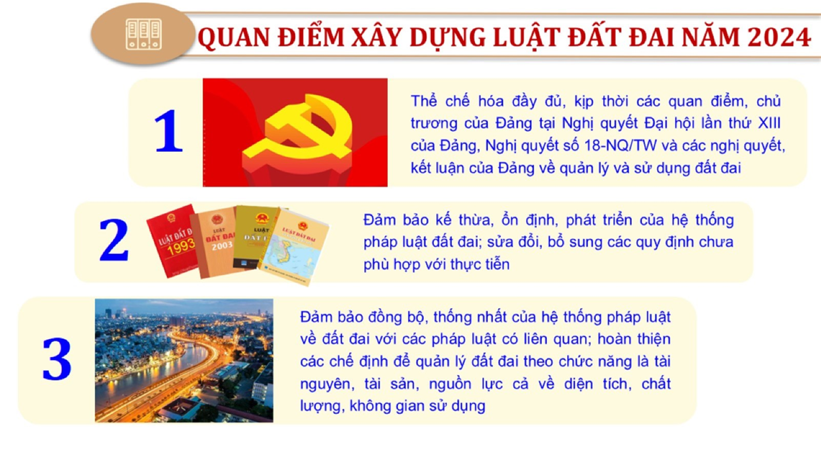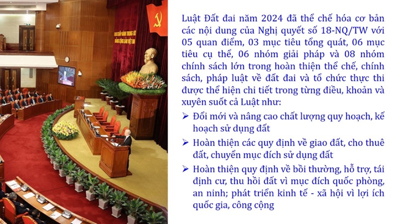 Từ lịch sử xây dựng và hoàn thiện Luật Đất đai từ năm 1998 đến năm 2024, Luật Đất đai đã trải qua 09 lần sửa đổi và bổ sung; Cơ sở xây dựng Luật Đất đai năm 2024 với hai cơ sơ chính là cơ sở chính trị và có sở thực tiễn; Quan điểm xây dựng Luật Đất đai năm 2024 với 06 nội dung lớn. Cụ thể: Một là, thể chế hóa đầy đủ, kịp thời các quan điểm, chủ trương của Đảng tại Nghị quyết Đại hội lần thứ XIII của Đảng, Nghị quyết số 18-NQ/TW và các nghị quyết, kết luận của Đảng về quản lý và sử dụng đất đai; hai là, đảm bảo kế thừa, ổn định, phát triển của hệ thống pháp luật đất đai; sửa đổi, bổ sung các quy định chưa phù hợp với thực tiễn; ba là, đảm bảo đồng bộ, thống nhất của hệ thống pháp luật về đất đai với các pháp luật có liên quan; hoàn thiện các chế định để quản lý đất đai theo chức năng là tài nguyên, tài sản, nguồn lực cả về diện tích, chất lượng, không gian sử dụng; bốn là tiếp tục đẩy mạnh phân cấp, phân quyền đồng thời thiết lập công cụ kiểm soát quyền lực của cơ quan và người có thẩm quyền trong quản lý đất đai. Tăng cường vai trò giám sát của Quốc hội, Hội đồng nhân dân, Mặt trận Tổ quốc Việt Nam, tổ chức chính trị - xã hội các cấp và Nhân dân; năm là, đẩy mạnh cải cách thủ tục hành chính; chuyển trọng tâm từ quản lý bằng các công cụ hành chính sang sử dụng hiệu quả các công cụ kinh tế để thúc đẩy sử dụng đất hợp lý, hiệu quả, bền vững; sáu là, hiện đại hóa, chuyển đổi số công tác quản lý đất đai dựa trên hệ thống thông tin, dữ liệu đất đai thống nhất, tập trung, phục vụ đa mục tiêu kết nối từ Trung ương đến địa phương, quản lý biến động đến từng thửa đất.