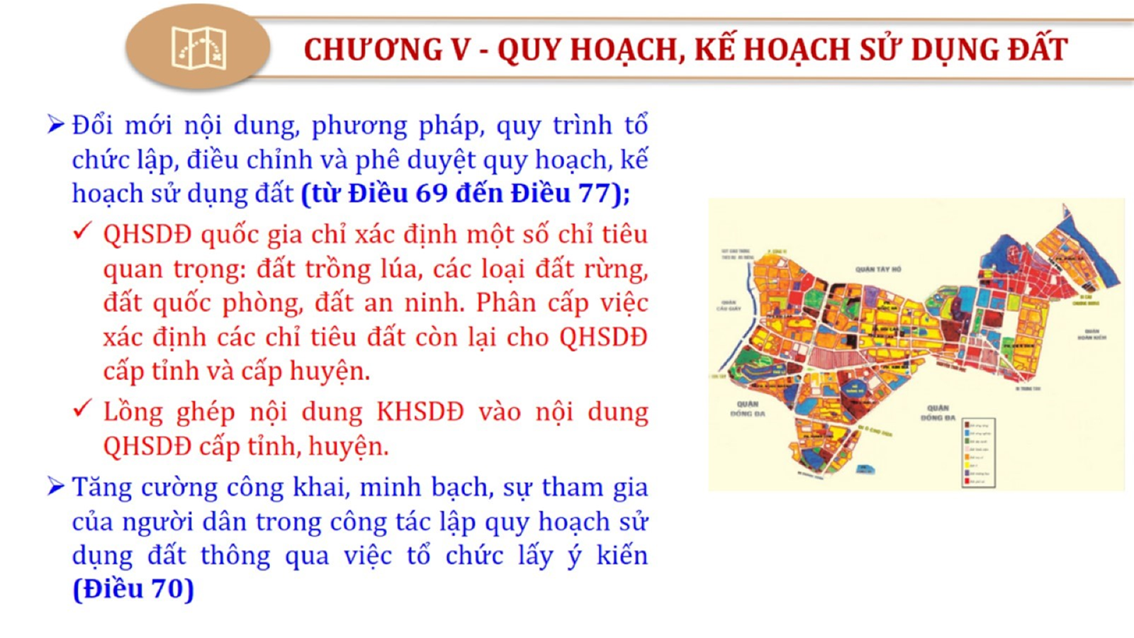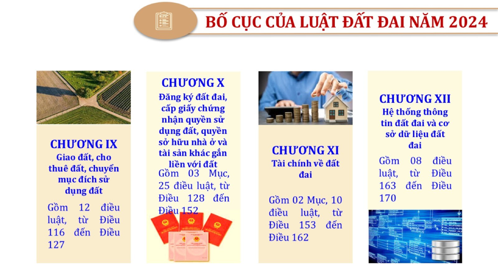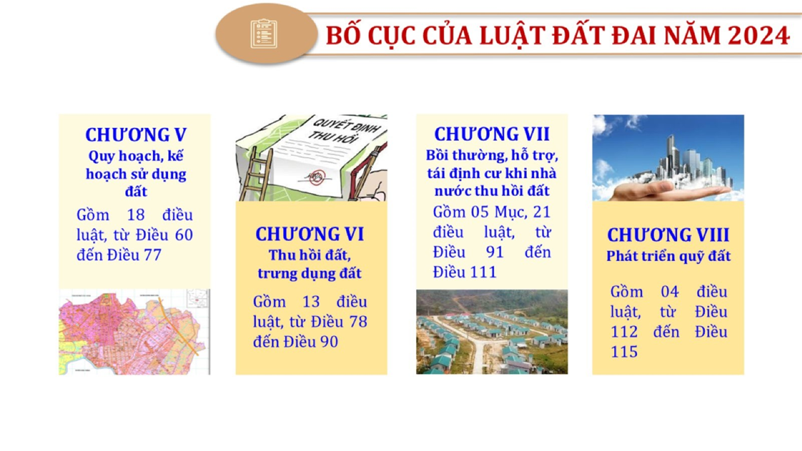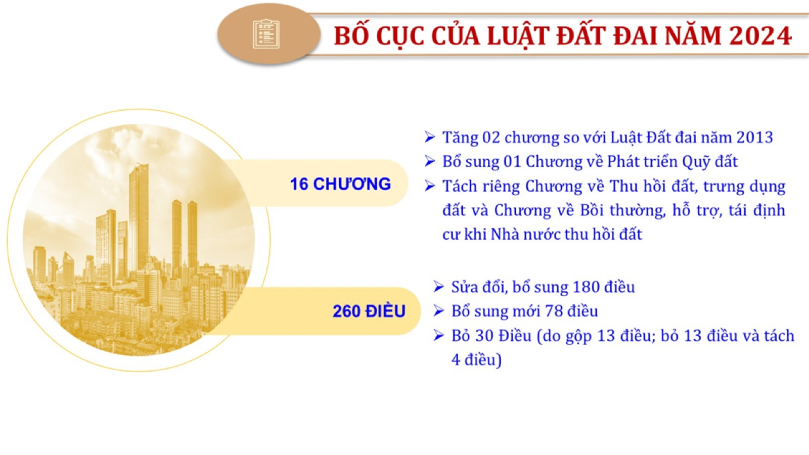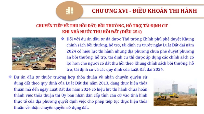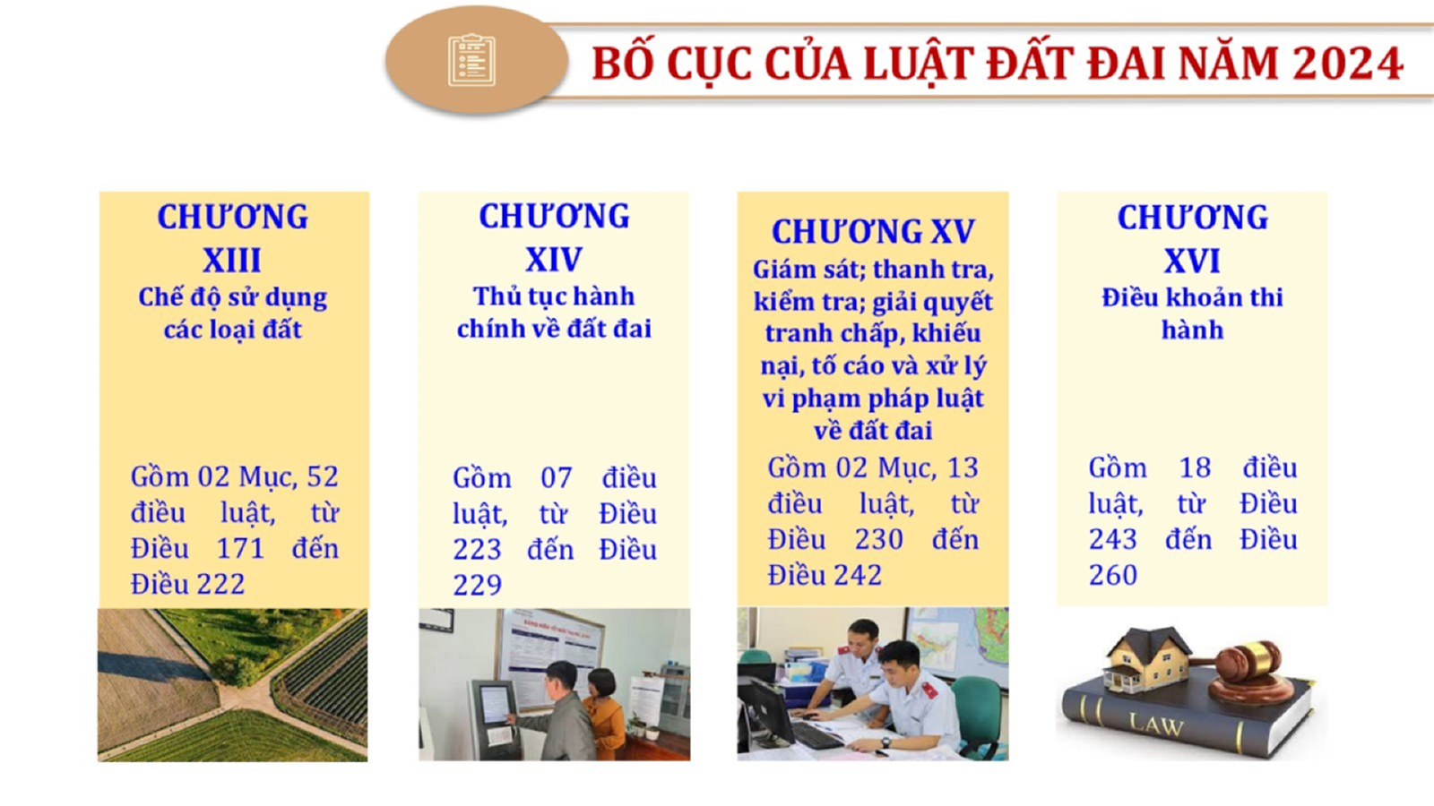 Từ lịch sử xây dựng và hoàn thiện Luật Đất đai từ năm 1998 đến năm 2024, Luật Đất đai đã trải qua 09 lần sửa đổi và bổ sung; Cơ sở xây dựng Luật Đất đai năm 2024 với hai cơ sơ chính là cơ sở chính trị và có sở thực tiễn; Quan điểm xây dựng Luật Đất đai năm 2024 với 06 nội dung lớn. Cụ thể: Một là, thể chế hóa đầy đủ, kịp thời các quan điểm, chủ trương của Đảng tại Nghị quyết Đại hội lần thứ XIII của Đảng, Nghị quyết số 18-NQ/TW và các nghị quyết, kết luận của Đảng về quản lý và sử dụng đất đai; hai là, đảm bảo kế thừa, ổn định, phát triển của hệ thống pháp luật đất đai; sửa đổi, bổ sung các quy định chưa phù hợp với thực tiễn; ba là, đảm bảo đồng bộ, thống nhất của hệ thống pháp luật về đất đai với các pháp luật có liên quan; hoàn thiện các chế định để quản lý đất đai theo chức năng là tài nguyên, tài sản, nguồn lực cả về diện tích, chất lượng, không gian sử dụng; bốn là tiếp tục đẩy mạnh phân cấp, phân quyền đồng thời thiết lập công cụ kiểm soát quyền lực của cơ quan và người có thẩm quyền trong quản lý đất đai. Tăng cường vai trò giám sát của Quốc hội, Hội đồng nhân dân, Mặt trận Tổ quốc Việt Nam, tổ chức chính trị - xã hội các cấp và Nhân dân; năm là, đẩy mạnh cải cách thủ tục hành chính; chuyển trọng tâm từ quản lý bằng các công cụ hành chính sang sử dụng hiệu quả các công cụ kinh tế để thúc đẩy sử dụng đất hợp lý, hiệu quả, bền vững; sáu là, hiện đại hóa, chuyển đổi số công tác quản lý đất đai dựa trên hệ thống thông tin, dữ liệu đất đai thống nhất, tập trung, phục vụ đa mục tiêu kết nối từ Trung ương đến địa phương, quản lý biến động đến từng thửa đất.