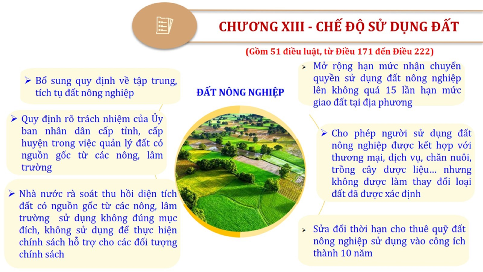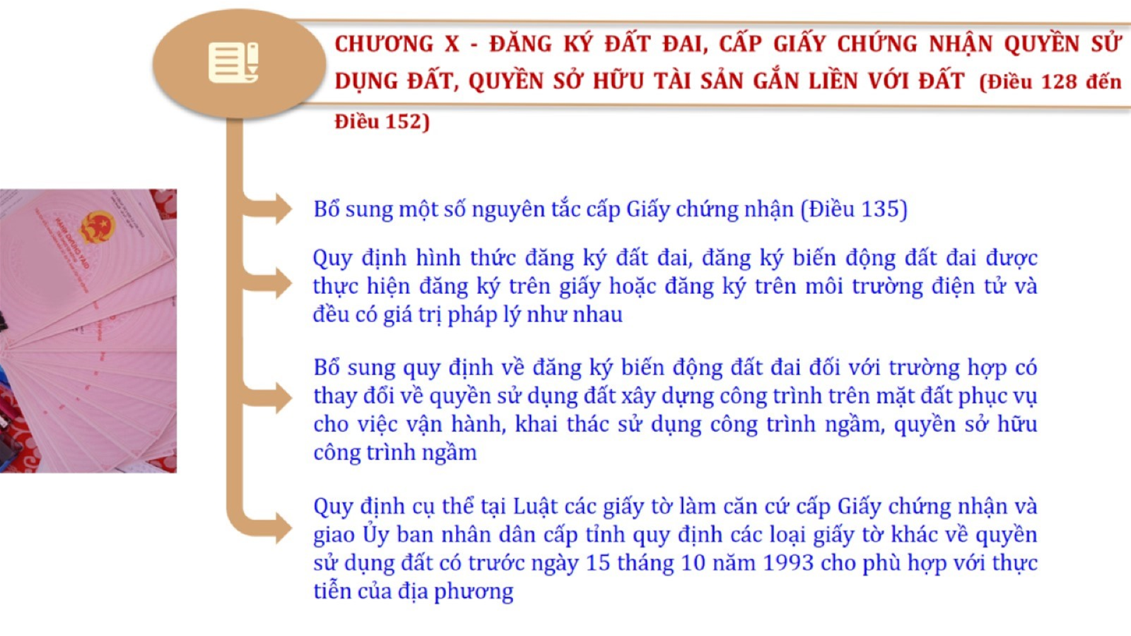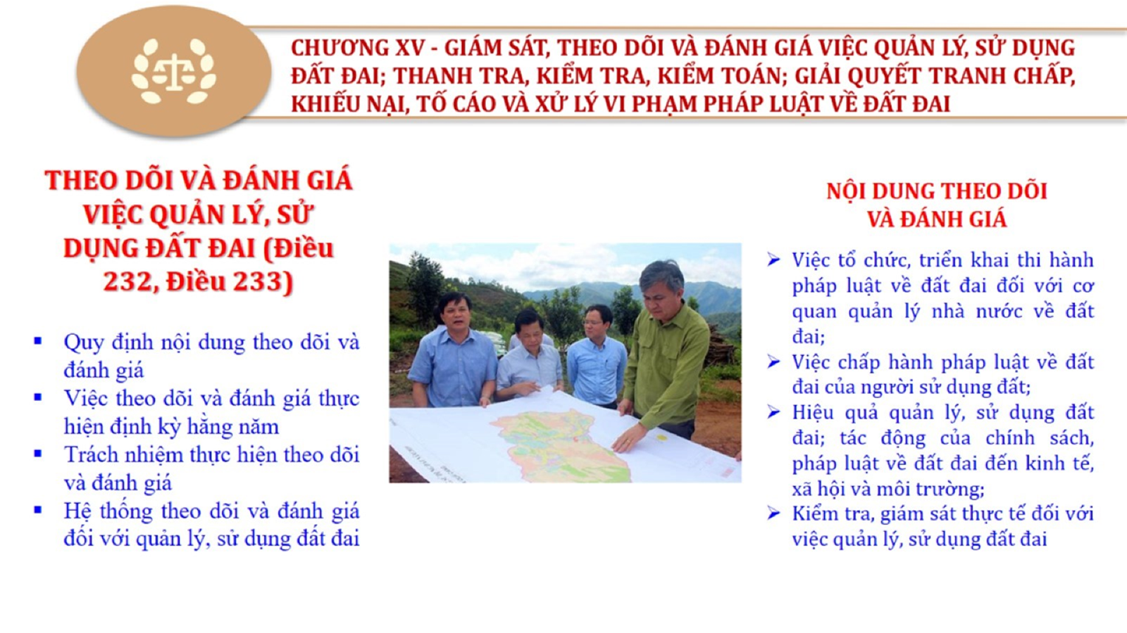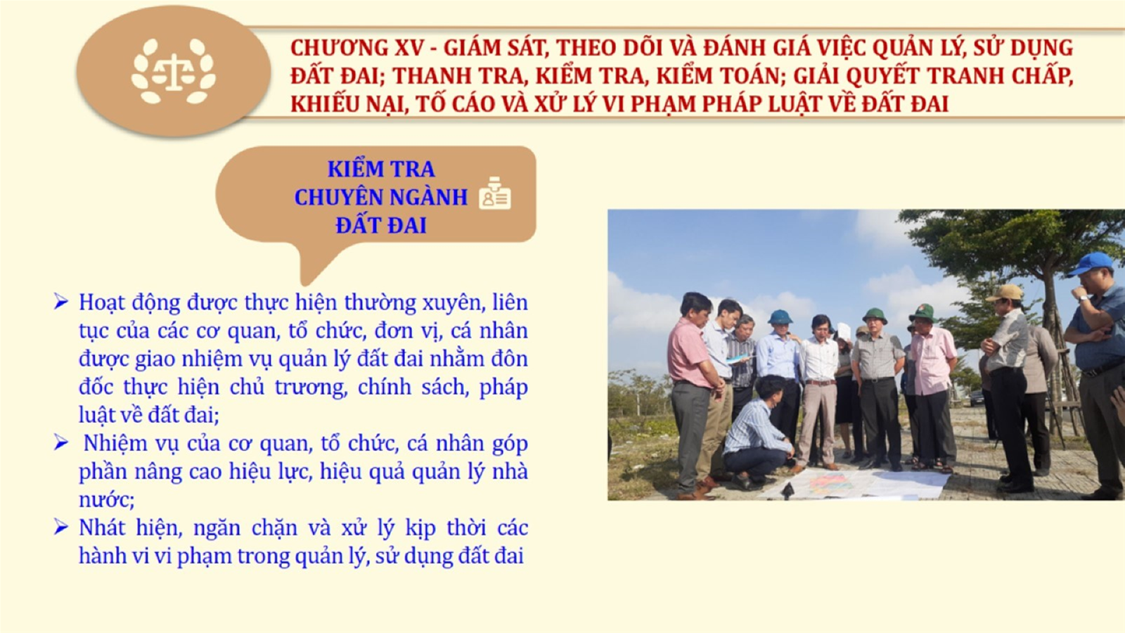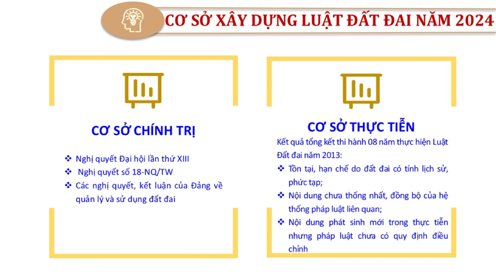 Từ lịch sử xây dựng và hoàn thiện Luật Đất đai từ năm 1998 đến năm 2024, Luật Đất đai đã trải qua 09 lần sửa đổi và bổ sung; Cơ sở xây dựng Luật Đất đai năm 2024 với hai cơ sơ chính là cơ sở chính trị và có sở thực tiễn; Quan điểm xây dựng Luật Đất đai năm 2024 với 06 nội dung lớn. Cụ thể: Một là, thể chế hóa đầy đủ, kịp thời các quan điểm, chủ trương của Đảng tại Nghị quyết Đại hội lần thứ XIII của Đảng, Nghị quyết số 18-NQ/TW và các nghị quyết, kết luận của Đảng về quản lý và sử dụng đất đai; hai là, đảm bảo kế thừa, ổn định, phát triển của hệ thống pháp luật đất đai; sửa đổi, bổ sung các quy định chưa phù hợp với thực tiễn; ba là, đảm bảo đồng bộ, thống nhất của hệ thống pháp luật về đất đai với các pháp luật có liên quan; hoàn thiện các chế định để quản lý đất đai theo chức năng là tài nguyên, tài sản, nguồn lực cả về diện tích, chất lượng, không gian sử dụng; bốn là tiếp tục đẩy mạnh phân cấp, phân quyền đồng thời thiết lập công cụ kiểm soát quyền lực của cơ quan và người có thẩm quyền trong quản lý đất đai. Tăng cường vai trò giám sát của Quốc hội, Hội đồng nhân dân, Mặt trận Tổ quốc Việt Nam, tổ chức chính trị - xã hội các cấp và Nhân dân; năm là, đẩy mạnh cải cách thủ tục hành chính; chuyển trọng tâm từ quản lý bằng các công cụ hành chính sang sử dụng hiệu quả các công cụ kinh tế để thúc đẩy sử dụng đất hợp lý, hiệu quả, bền vững; sáu là, hiện đại hóa, chuyển đổi số công tác quản lý đất đai dựa trên hệ thống thông tin, dữ liệu đất đai thống nhất, tập trung, phục vụ đa mục tiêu kết nối từ Trung ương đến địa phương, quản lý biến động đến từng thửa đất.