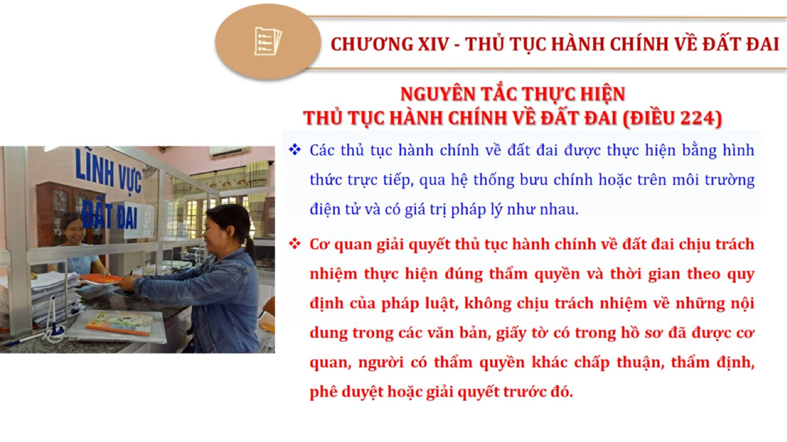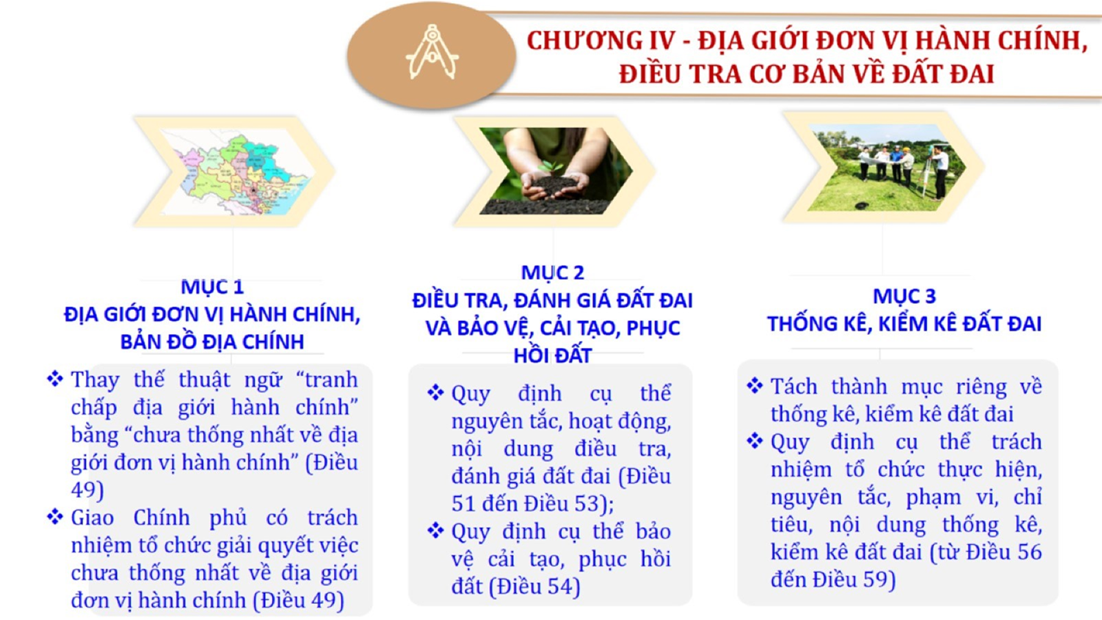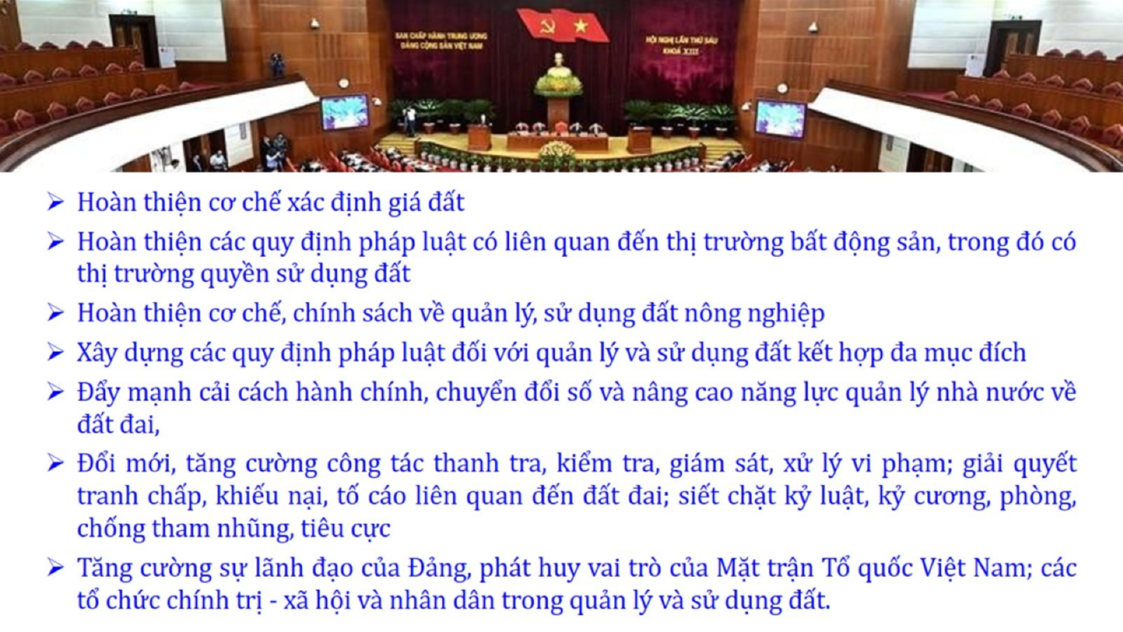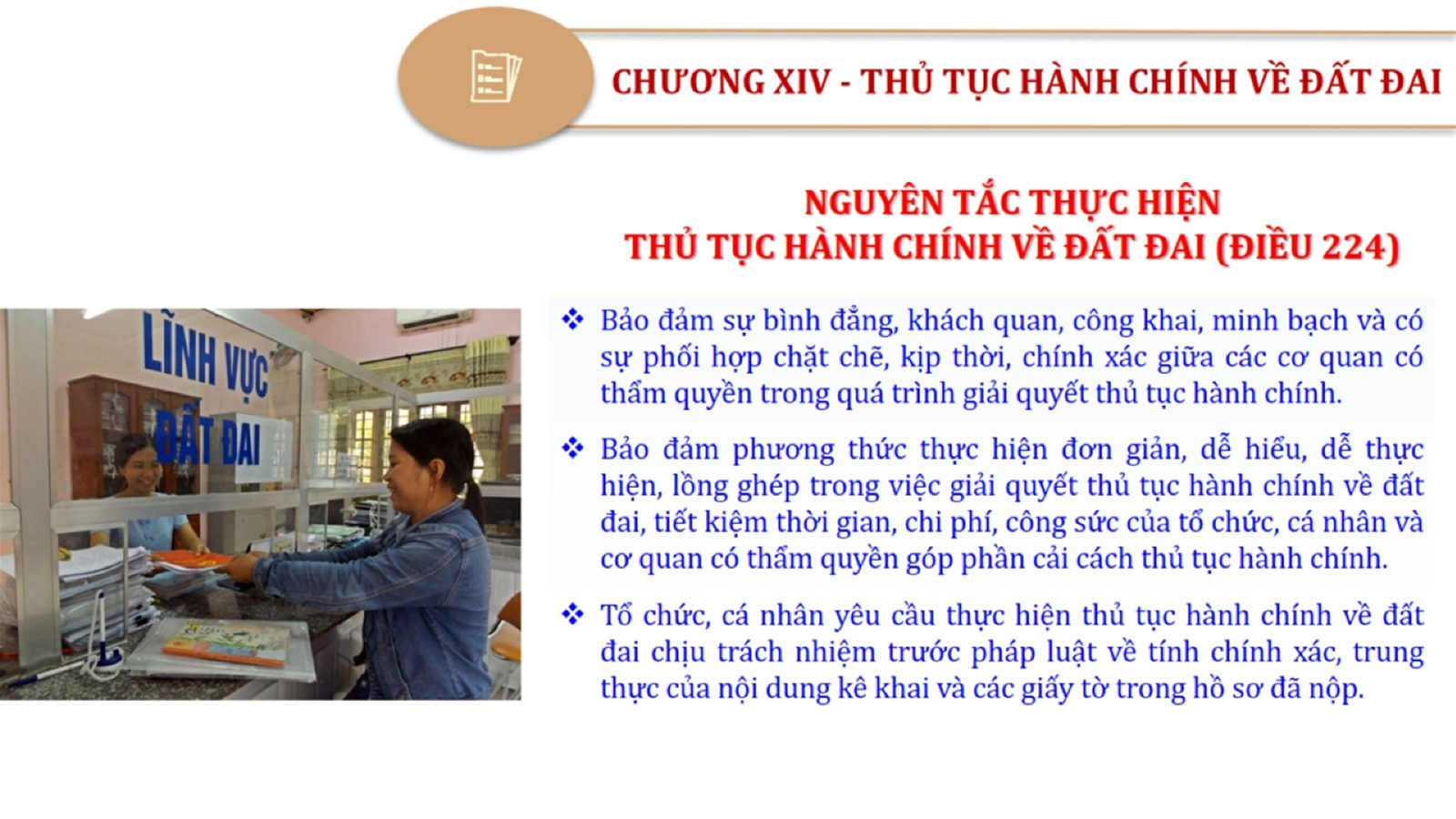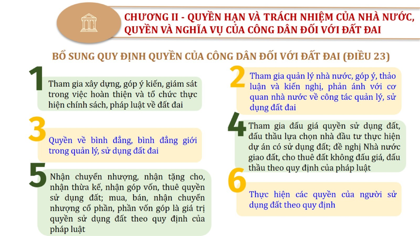 Từ lịch sử xây dựng và hoàn thiện Luật Đất đai từ năm 1998 đến năm 2024, Luật Đất đai đã trải qua 09 lần sửa đổi và bổ sung; Cơ sở xây dựng Luật Đất đai năm 2024 với hai cơ sơ chính là cơ sở chính trị và có sở thực tiễn; Quan điểm xây dựng Luật Đất đai năm 2024 với 06 nội dung lớn. Cụ thể: Một là, thể chế hóa đầy đủ, kịp thời các quan điểm, chủ trương của Đảng tại Nghị quyết Đại hội lần thứ XIII của Đảng, Nghị quyết số 18-NQ/TW và các nghị quyết, kết luận của Đảng về quản lý và sử dụng đất đai; hai là, đảm bảo kế thừa, ổn định, phát triển của hệ thống pháp luật đất đai; sửa đổi, bổ sung các quy định chưa phù hợp với thực tiễn; ba là, đảm bảo đồng bộ, thống nhất của hệ thống pháp luật về đất đai với các pháp luật có liên quan; hoàn thiện các chế định để quản lý đất đai theo chức năng là tài nguyên, tài sản, nguồn lực cả về diện tích, chất lượng, không gian sử dụng; bốn là tiếp tục đẩy mạnh phân cấp, phân quyền đồng thời thiết lập công cụ kiểm soát quyền lực của cơ quan và người có thẩm quyền trong quản lý đất đai. Tăng cường vai trò giám sát của Quốc hội, Hội đồng nhân dân, Mặt trận Tổ quốc Việt Nam, tổ chức chính trị - xã hội các cấp và Nhân dân; năm là, đẩy mạnh cải cách thủ tục hành chính; chuyển trọng tâm từ quản lý bằng các công cụ hành chính sang sử dụng hiệu quả các công cụ kinh tế để thúc đẩy sử dụng đất hợp lý, hiệu quả, bền vững; sáu là, hiện đại hóa, chuyển đổi số công tác quản lý đất đai dựa trên hệ thống thông tin, dữ liệu đất đai thống nhất, tập trung, phục vụ đa mục tiêu kết nối từ Trung ương đến địa phương, quản lý biến động đến từng thửa đất.