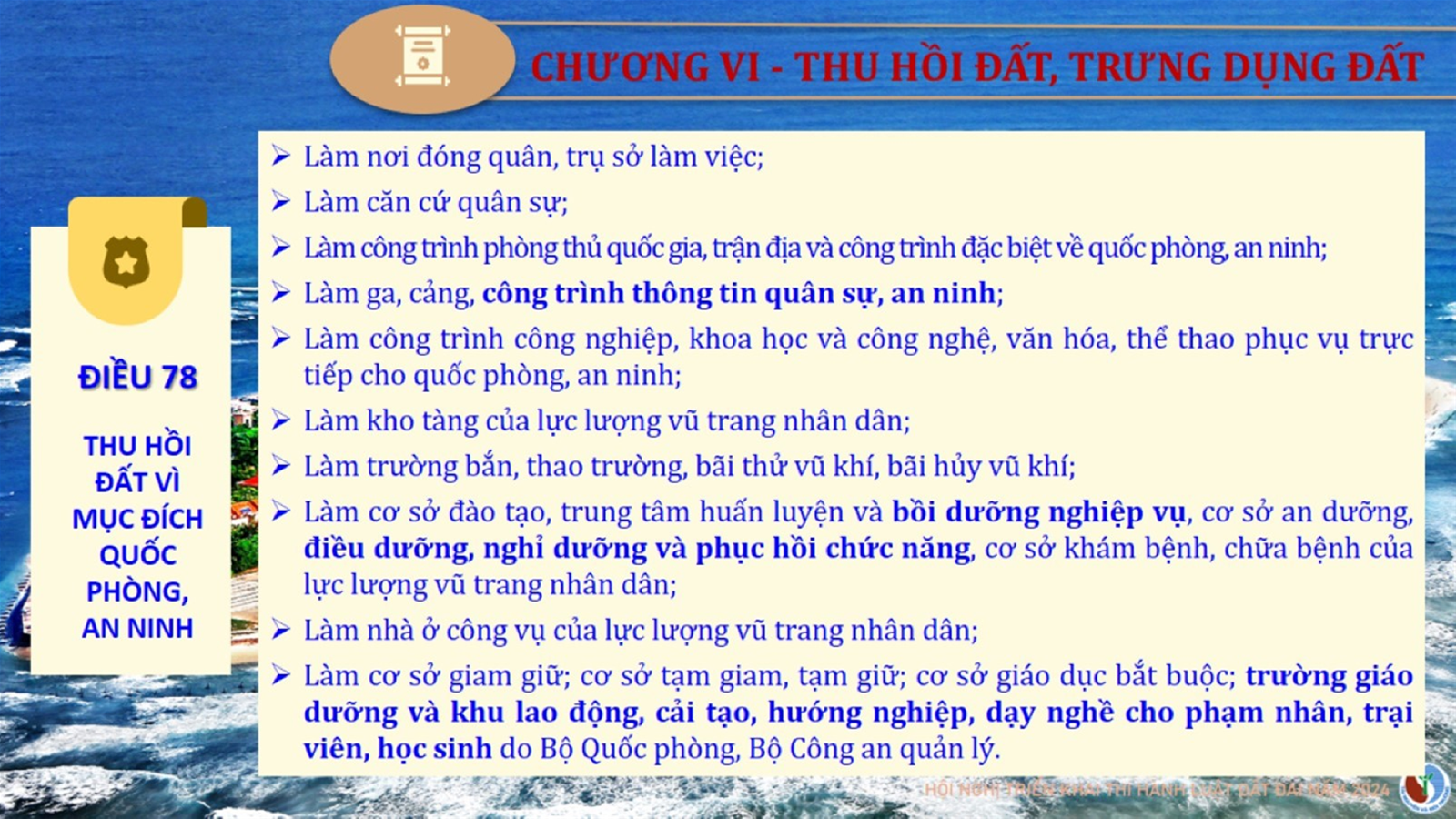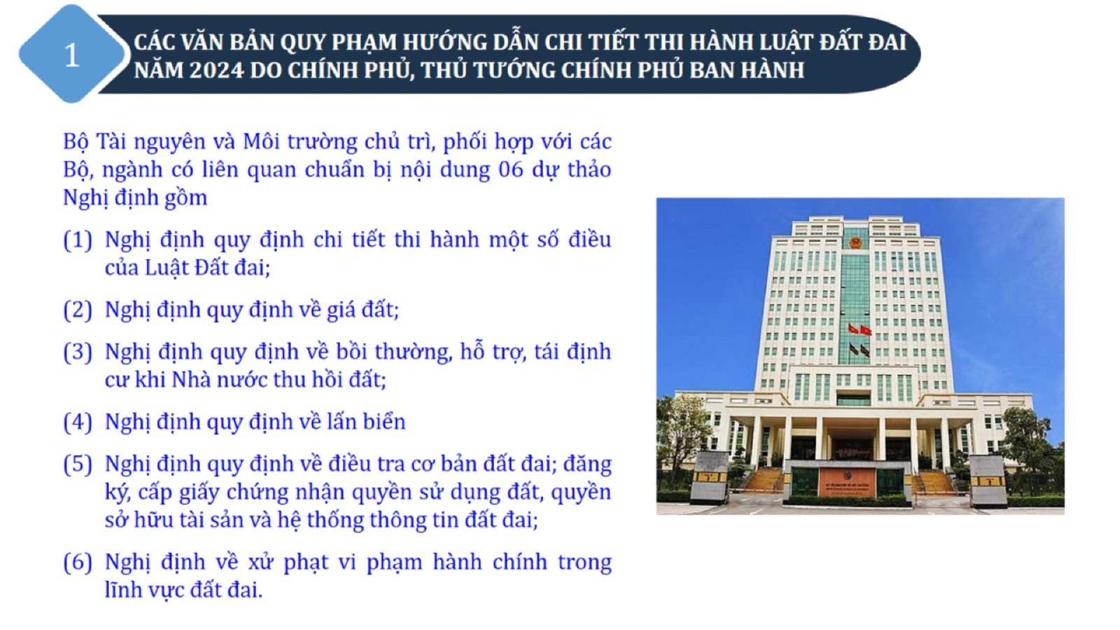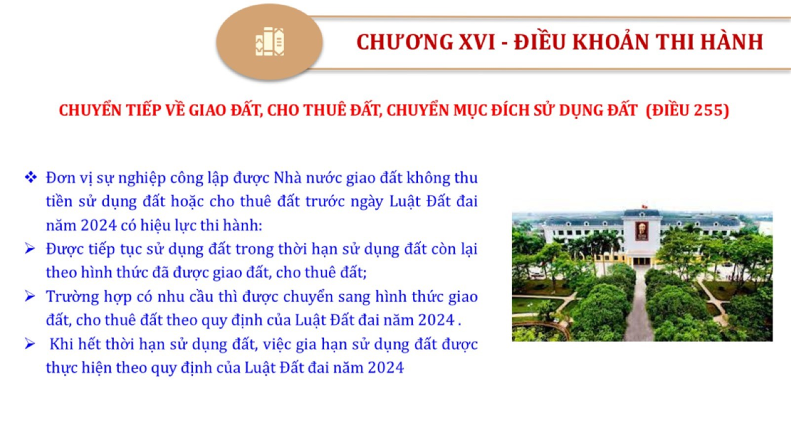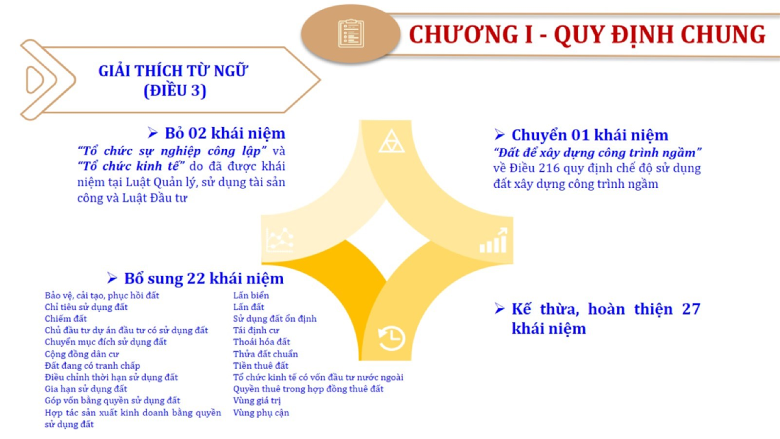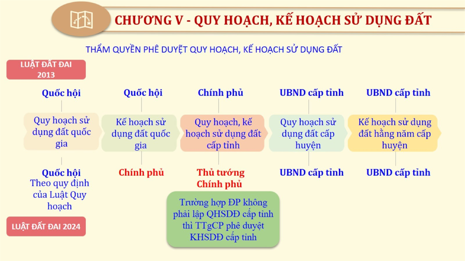 Từ lịch sử xây dựng và hoàn thiện Luật Đất đai từ năm 1998 đến năm 2024, Luật Đất đai đã trải qua 09 lần sửa đổi và bổ sung; Cơ sở xây dựng Luật Đất đai năm 2024 với hai cơ sơ chính là cơ sở chính trị và có sở thực tiễn; Quan điểm xây dựng Luật Đất đai năm 2024 với 06 nội dung lớn. Cụ thể: Một là, thể chế hóa đầy đủ, kịp thời các quan điểm, chủ trương của Đảng tại Nghị quyết Đại hội lần thứ XIII của Đảng, Nghị quyết số 18-NQ/TW và các nghị quyết, kết luận của Đảng về quản lý và sử dụng đất đai; hai là, đảm bảo kế thừa, ổn định, phát triển của hệ thống pháp luật đất đai; sửa đổi, bổ sung các quy định chưa phù hợp với thực tiễn; ba là, đảm bảo đồng bộ, thống nhất của hệ thống pháp luật về đất đai với các pháp luật có liên quan; hoàn thiện các chế định để quản lý đất đai theo chức năng là tài nguyên, tài sản, nguồn lực cả về diện tích, chất lượng, không gian sử dụng; bốn là tiếp tục đẩy mạnh phân cấp, phân quyền đồng thời thiết lập công cụ kiểm soát quyền lực của cơ quan và người có thẩm quyền trong quản lý đất đai. Tăng cường vai trò giám sát của Quốc hội, Hội đồng nhân dân, Mặt trận Tổ quốc Việt Nam, tổ chức chính trị - xã hội các cấp và Nhân dân; năm là, đẩy mạnh cải cách thủ tục hành chính; chuyển trọng tâm từ quản lý bằng các công cụ hành chính sang sử dụng hiệu quả các công cụ kinh tế để thúc đẩy sử dụng đất hợp lý, hiệu quả, bền vững; sáu là, hiện đại hóa, chuyển đổi số công tác quản lý đất đai dựa trên hệ thống thông tin, dữ liệu đất đai thống nhất, tập trung, phục vụ đa mục tiêu kết nối từ Trung ương đến địa phương, quản lý biến động đến từng thửa đất.